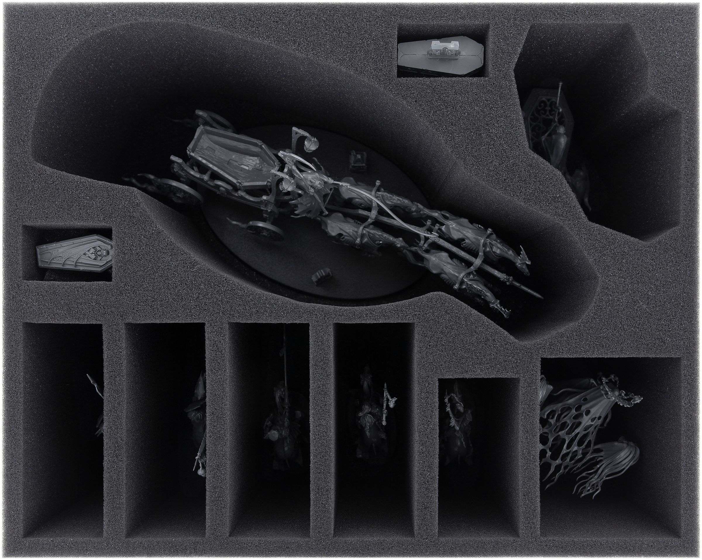 - 1 Feldherr Full-Size foam tray with ten compartments for Lady Olynder, Mortarch of Grief + Black Coach + Hexwraiths or Black Knights (FSMEFD130BO)