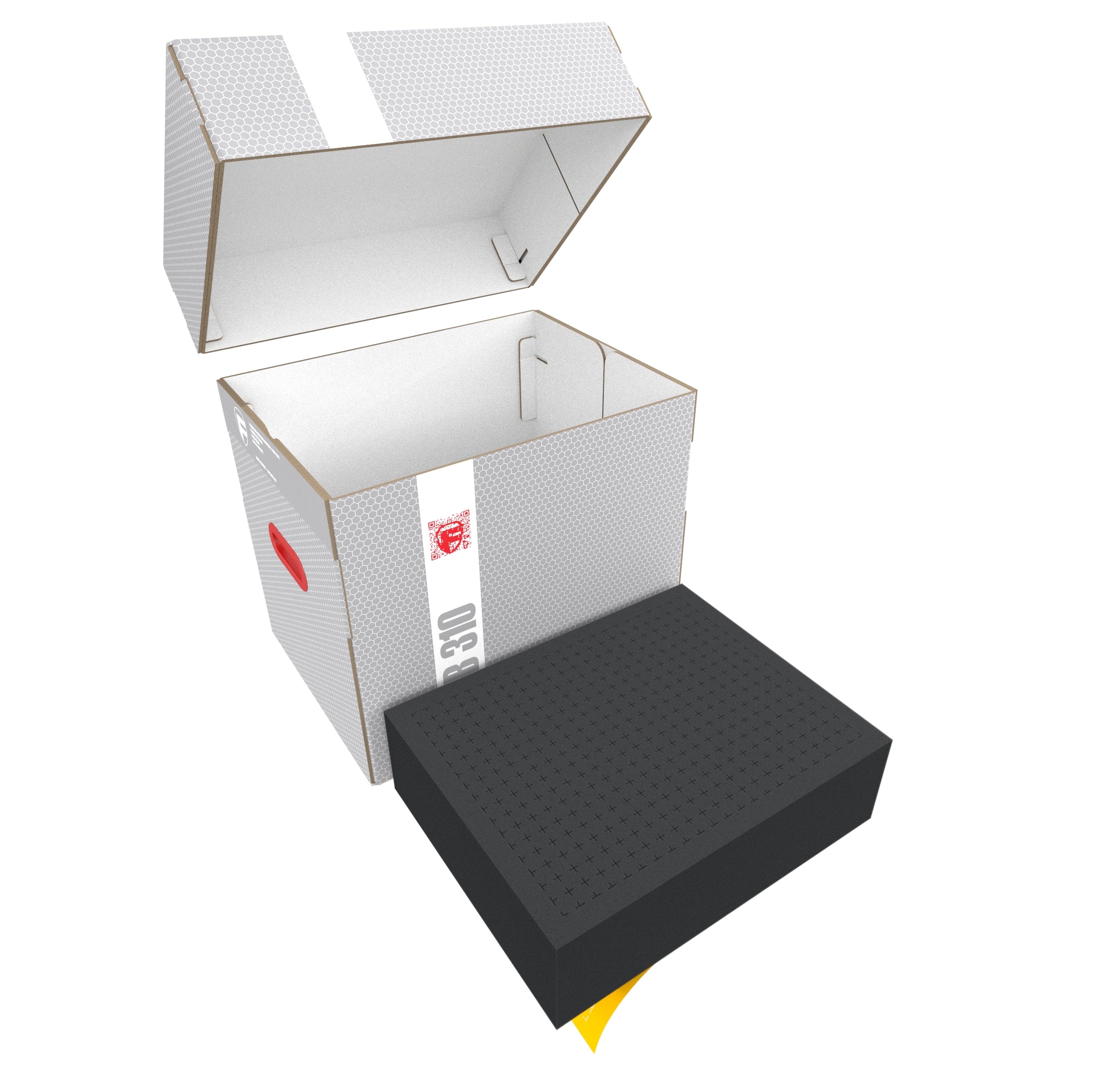 Our storage box FSLB310 contains matching foam for up to 88 miniatures on 40 mm base and large tanks or monsters. The fine-pored foam provides reliable protection against damage – fragile parts stay intact, the color of painted models remains unharmed.