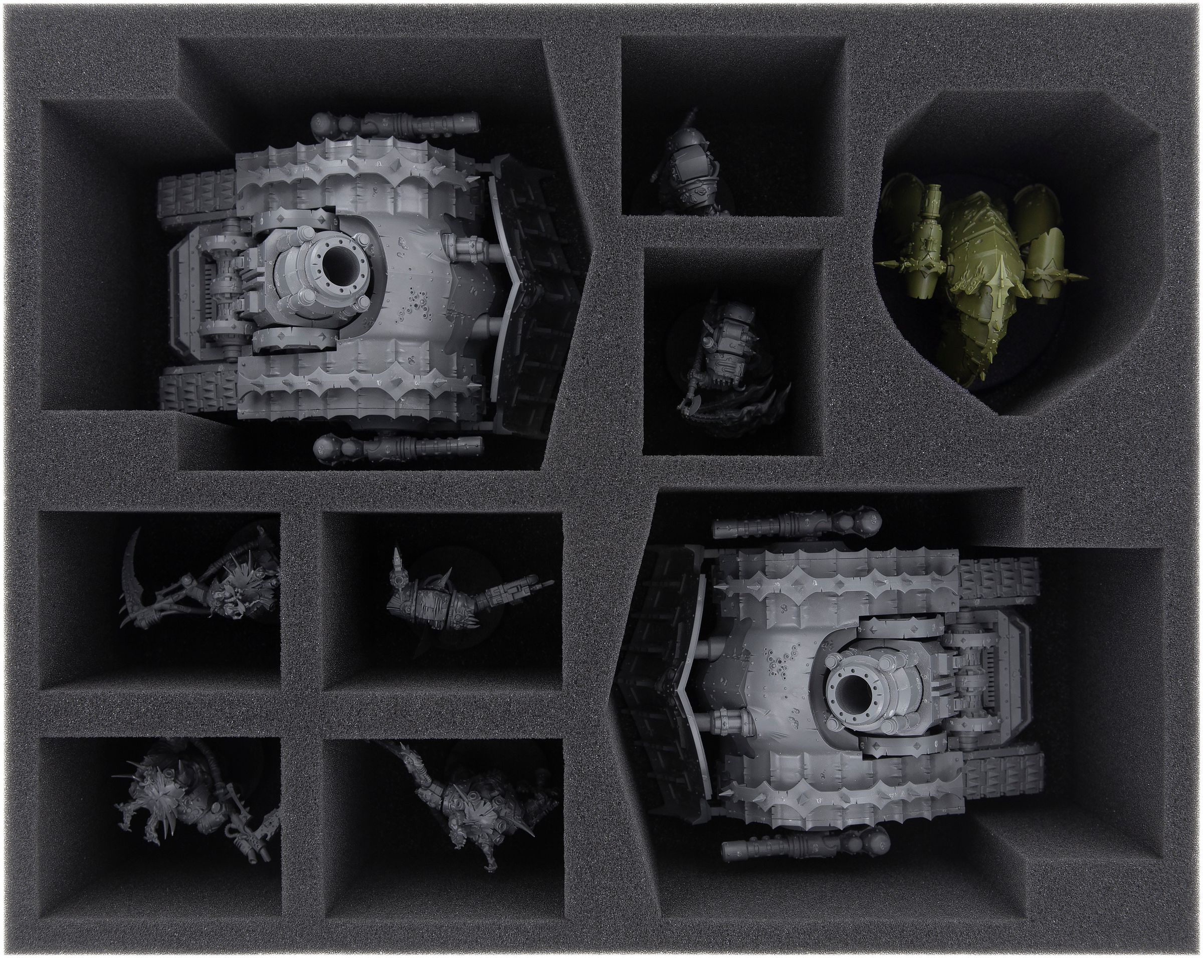 - 1 Full-Size foam tray for Chaos Rhino, Myphitic Blight-hauler, Plagueburst Crawler + 4 miniatures (FSMEFM090BO)