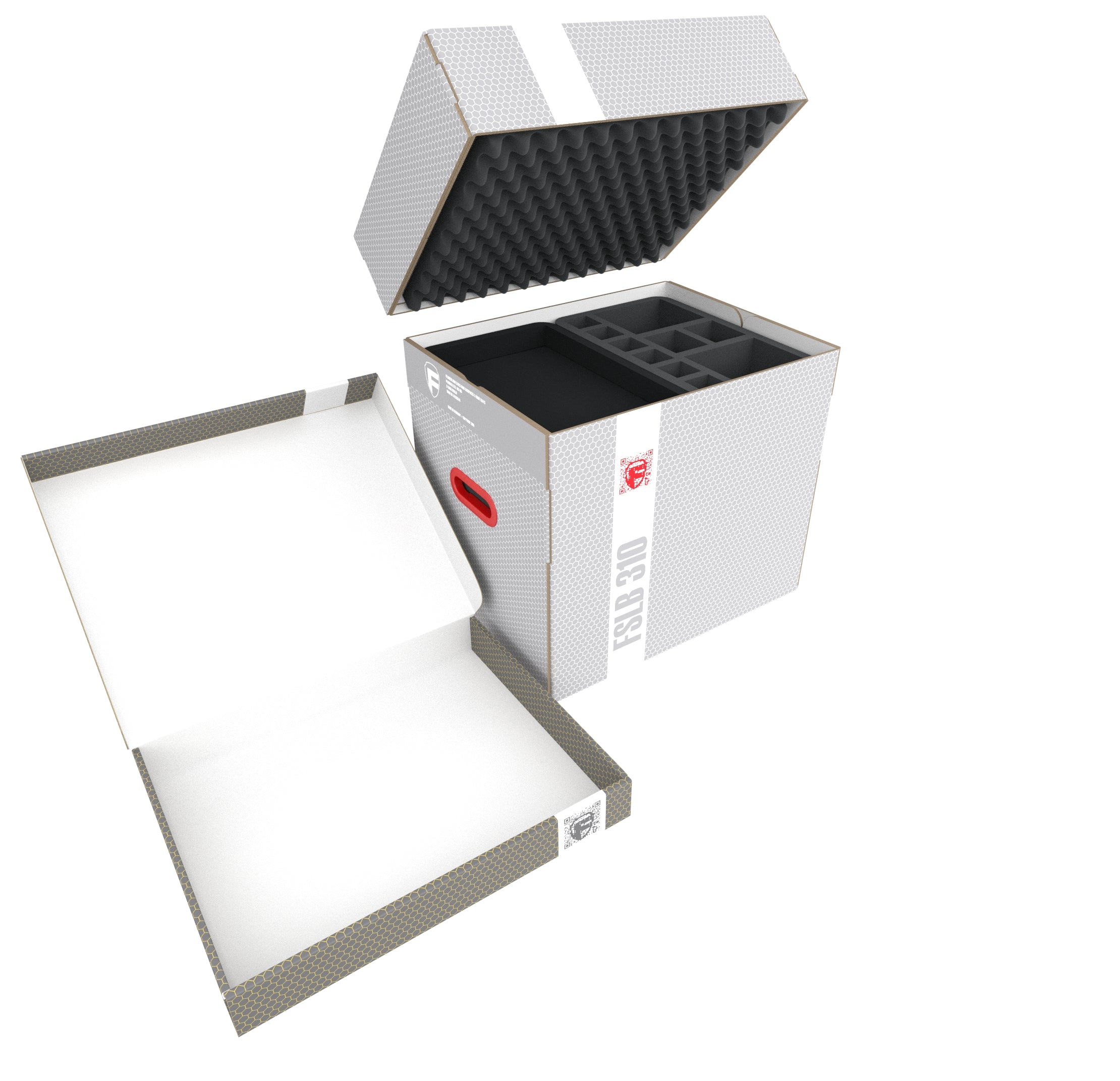 The TCHS105 card box and foam trays fit exactly into the large Storage Box FSLB310. The Feldherr Storage Boxes FSLB310 and FSLB040 are made of coated, single-wall cardboard. This means that they are not only pleasantly light, but also particularly tear-resistant and stable. The attachable lid of the FSLB310 reliably protects the contents from dust and other external influences. The FSLB310 can be easily transported with the two plastic-reinforced carrying handles on the sides.