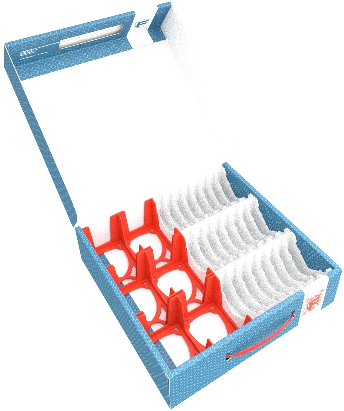 The LBBG075 storage box is made of coated, single-wall cardboard. This makes it not only lightweight but also particularly tear-resistant and stable. With matching foam inserts, miniatures and game materials can be safely stored and protected from dust. The practical plastic carrying handle allows for effortless transportation.
