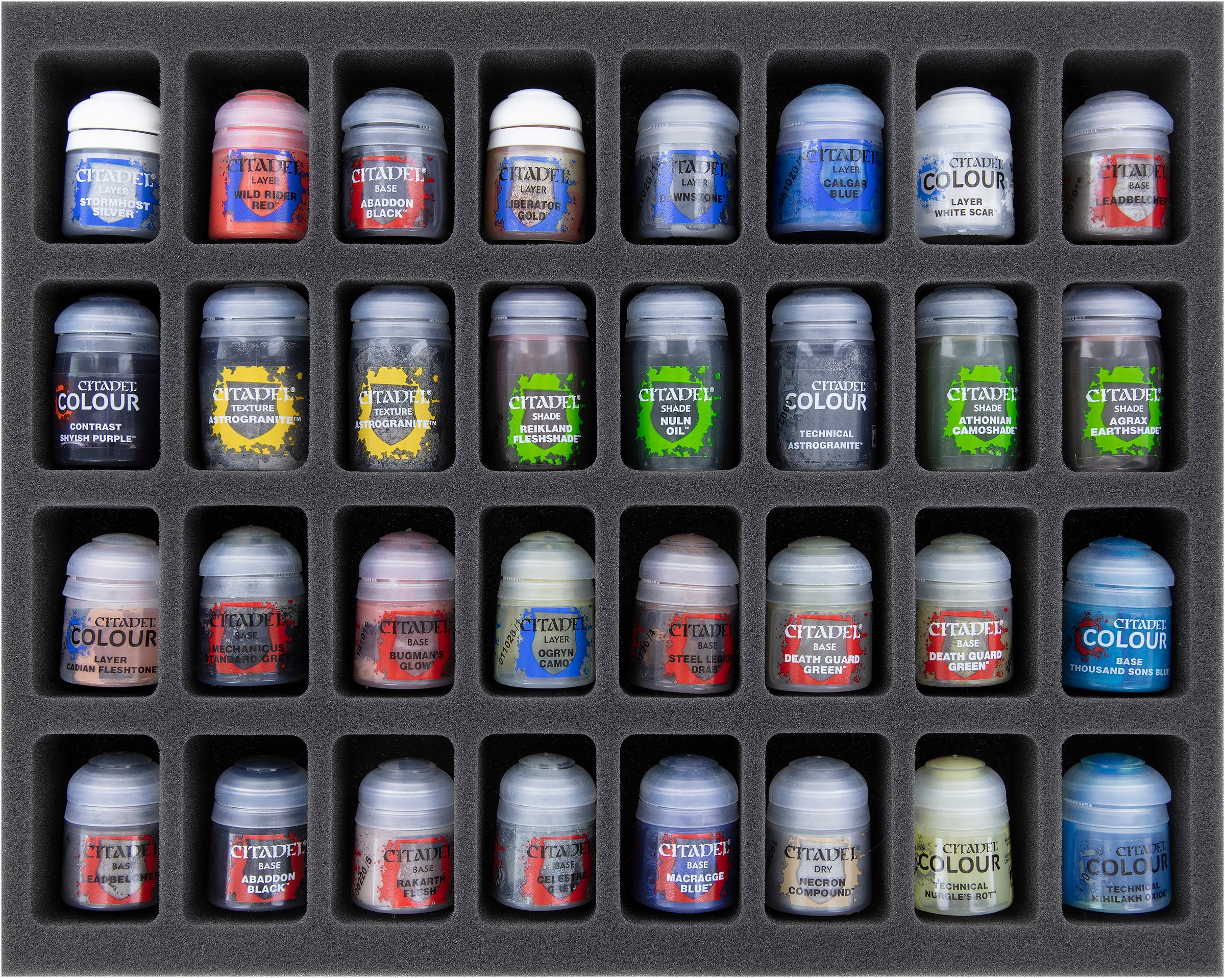 - 4 foam trays each for 32 miniatures or 12 ml, 18 ml, and 24 ml Citadel paint pots (FS045A006)