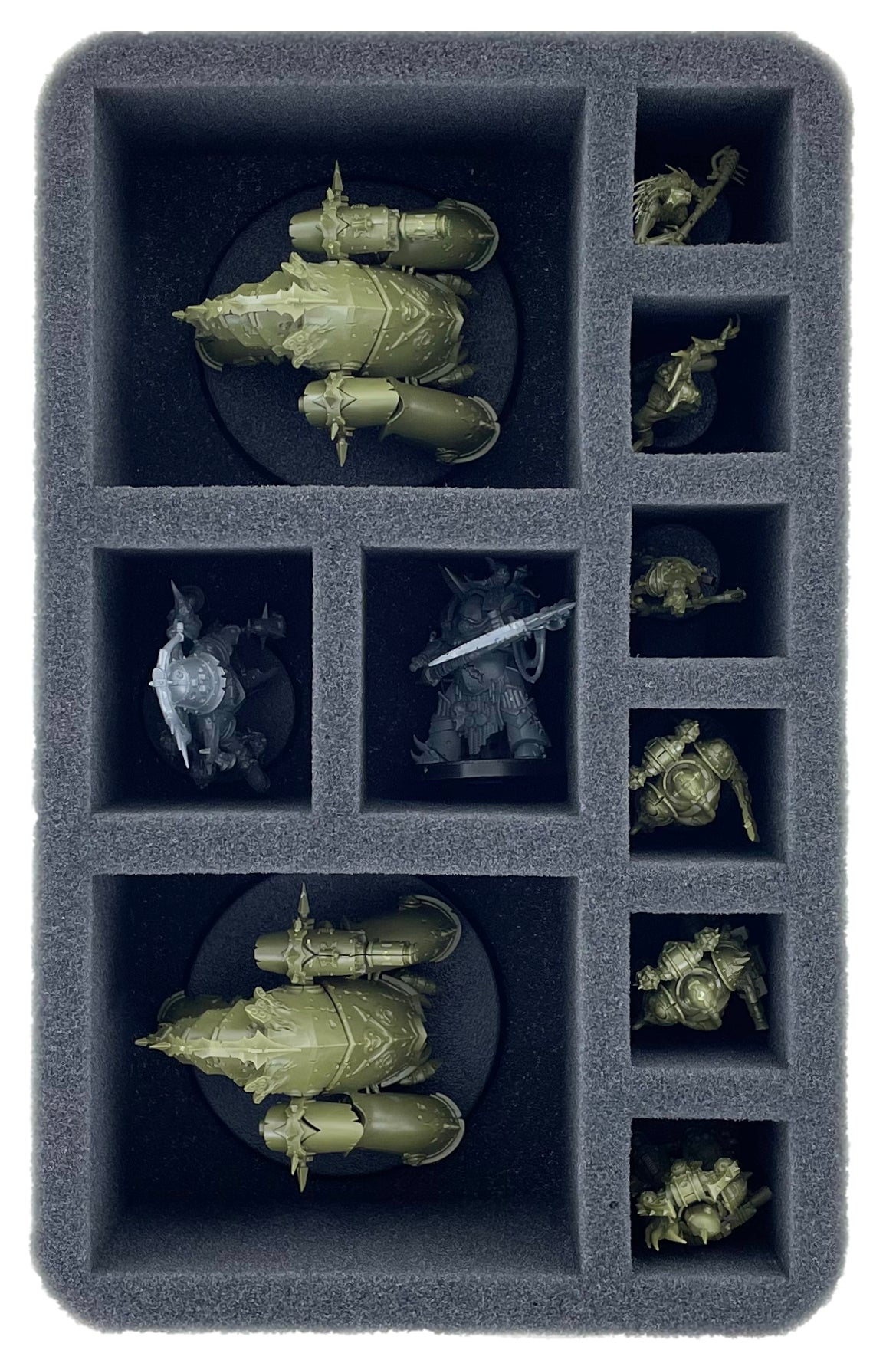 - 1 Full-Size foam tray with 9 compartments for two Plagueburst Crawler, one Myphitic Blight-hauler and six warrior models like Deathshroud Bodyguards, Poxwalker or Plague Marines (FSMEFM090BO)