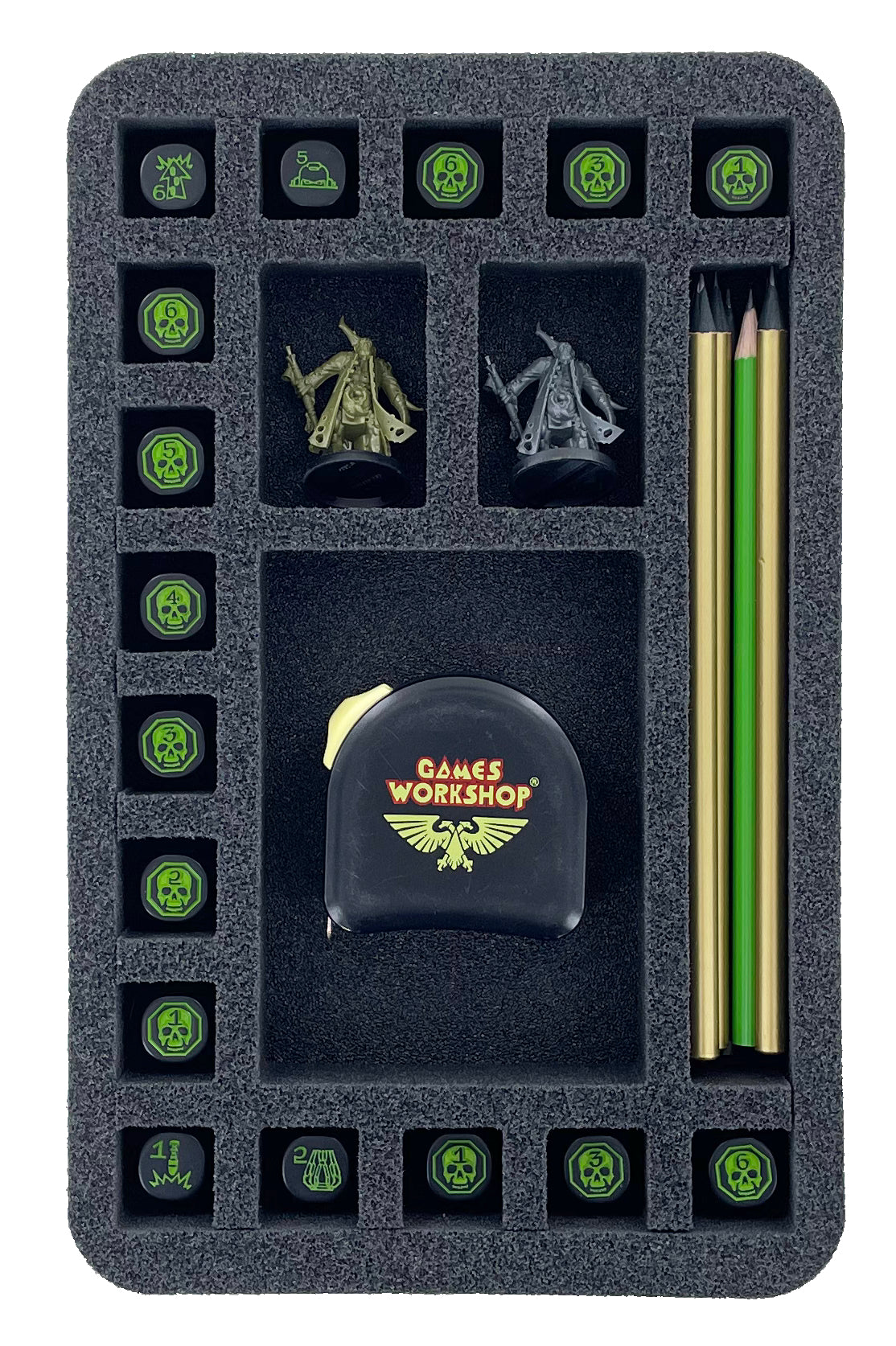 Custom-fit compartments made of soft foam reliably protect your miniatures from damage and also ensure that your painted units arrive safely at the tabletop without scratches.
