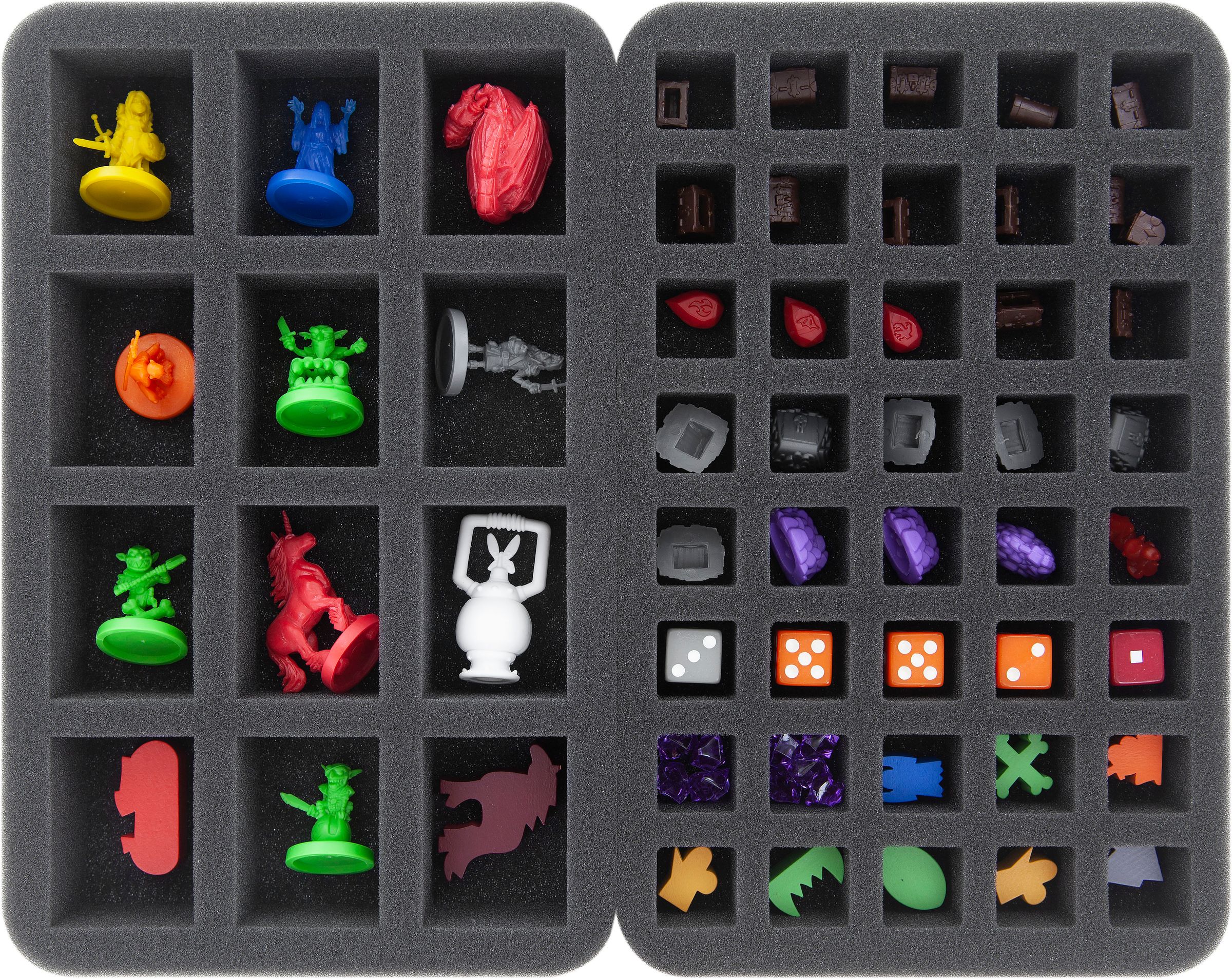 The set contains 5 foam trays to properly sort miniatures, dice, tokens, markers and (sleeved) cards. Your game material is thus splendidly organized and always at hand. The fine-pored foam provides reliable protection – sensitive parts remain unharmed, surfaces don’t get scratched. In addition, the set includes 2 foam toppers – the first is for leveling the tray stacks in the bag, the other serves as cover and makes sure nothing falls out during transport.