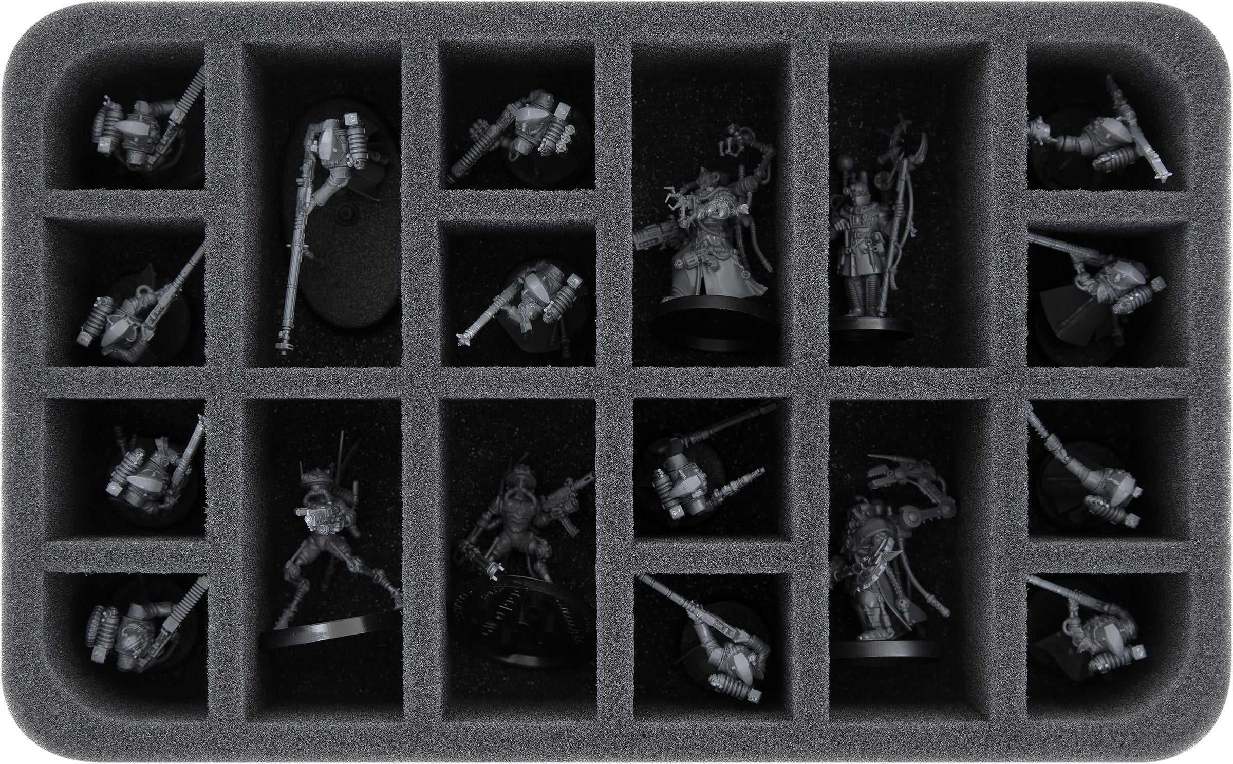 - 1 Half-Size foam tray with 18 compartments for e. g. Skitarii Vanguard/ Ranger und Sicarian Infiltrators/Ruststalkers (HS060A003)