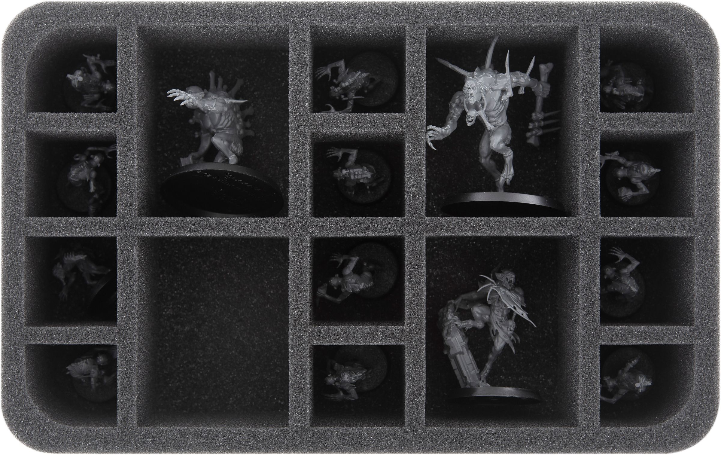 Two Half-Size inserts offer a safe place for all Ghoul miniatures from the GW core box. Precisely fitting compartments for each individual model ensure that the figures do not slide around or collide with each other during transport. This also ensures that the colors of the painted Flesh-eater Courts are completely safe from abrasion and scratches.