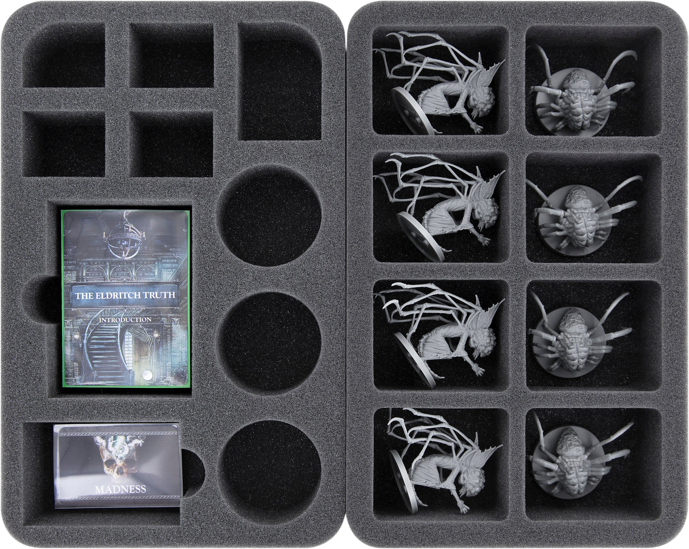 Two Half-Size Inserts are included to protect the 13 miniatures. From the Scholar to Rom's children, to the vacuous spider himself, Rom, each figure will find a safe place to store. Custom-fit compartments for each model ensure that the figures have a firm and secure hold. Even when transported up ancient, winding staircases, nothing slips. The soft, fine-pored foam protects delicate details from snapping off and the colors of your painted models from scratches and paint abrasion.