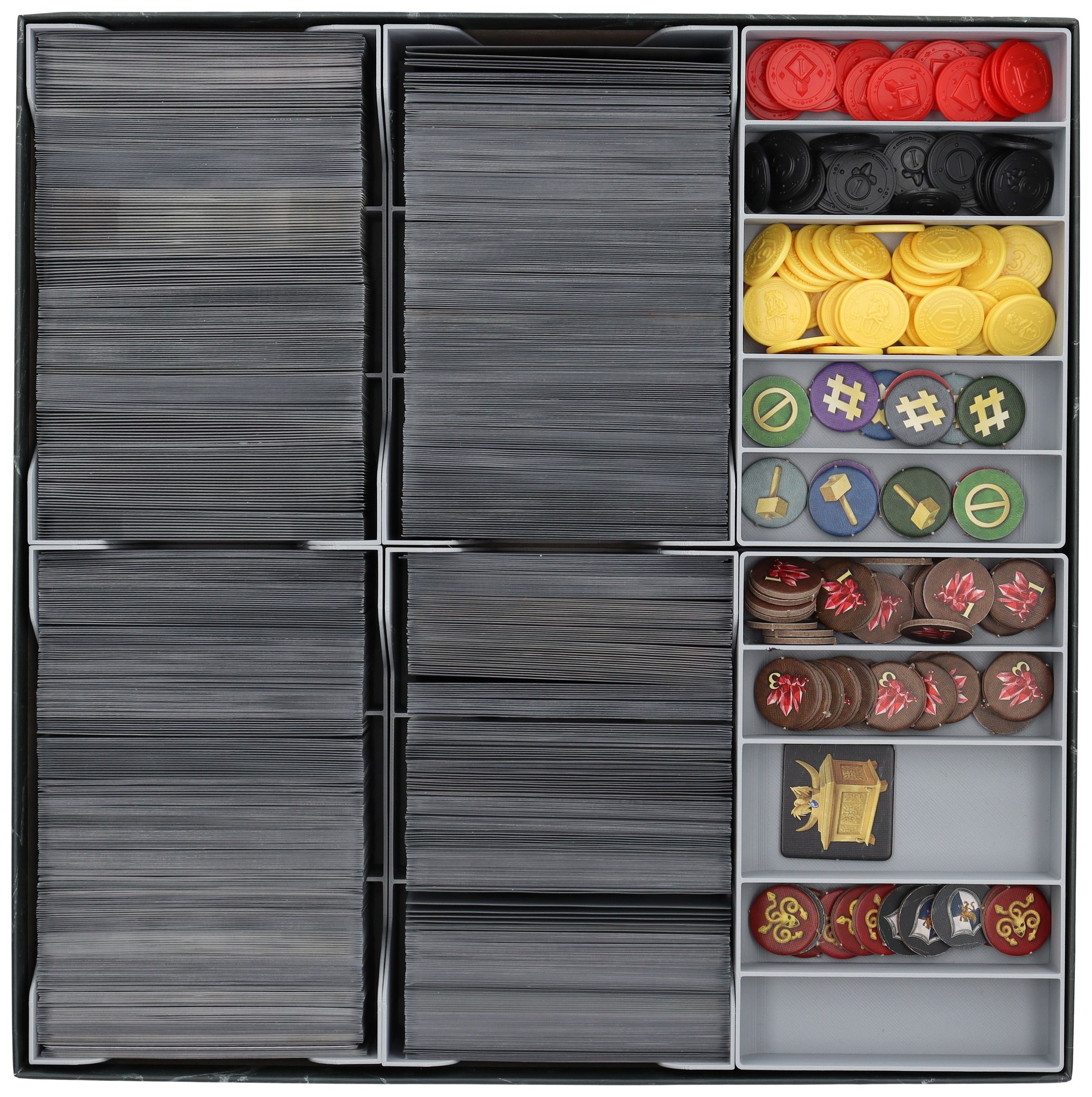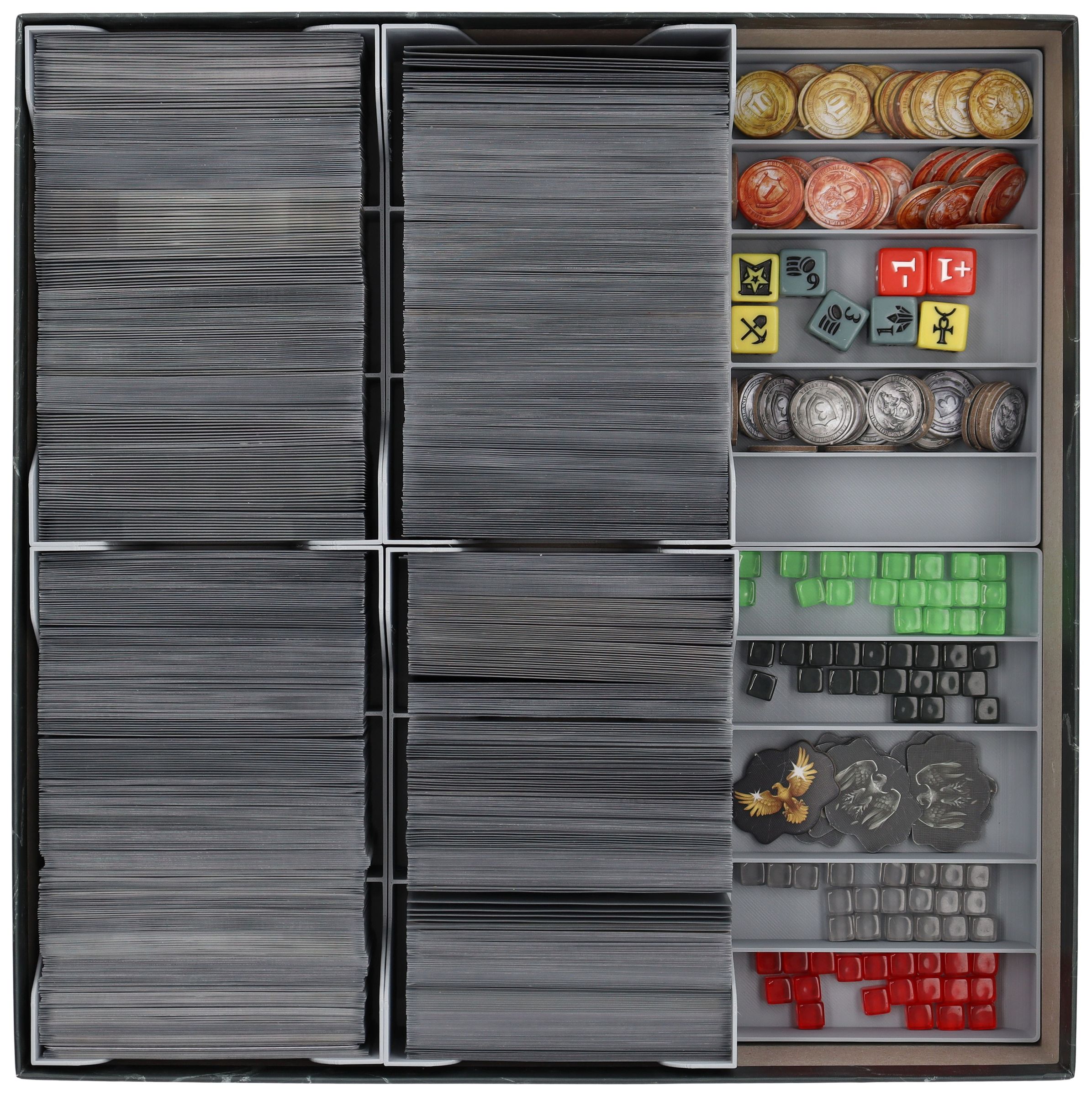 • It offers space for all small-format cards, tokens, dice, and acrylic cubes from the core game, as well as the five expansions and all stretch goals from the Kickstarter Gameplay All-In Pledge.
