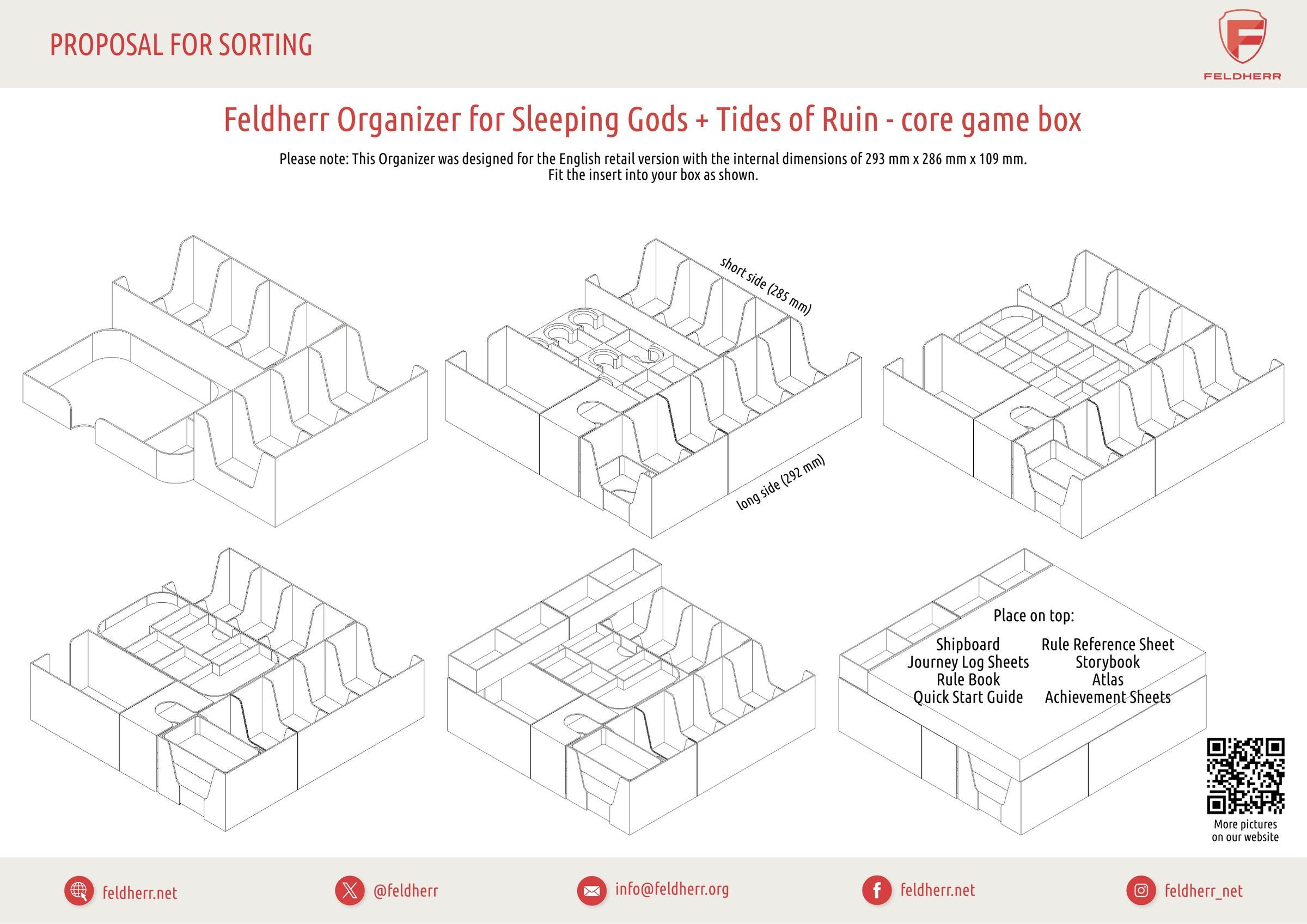 • The plastic Organizer fits perfectly into the original "Sleeping Gods" core game box. Please note: Our solution was designed for the English retail version with the internal dimensions of 293 mm x 286 mm x 109 mm. (Organizer dimensions: approximately 292 mm x 285 mm x 102 mm).