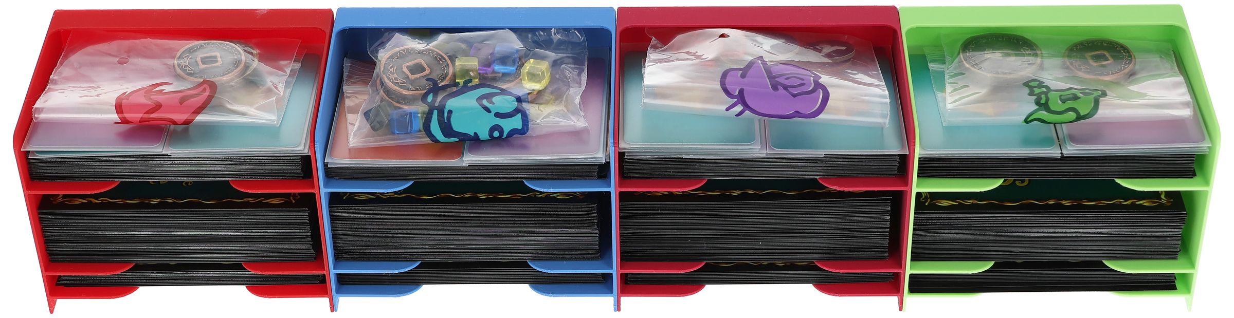 • You can keep all unlockable cards neatly sorted in the large card holder. Of course, the player trays offer additional space for the cards that are unlocked during the course of the game.