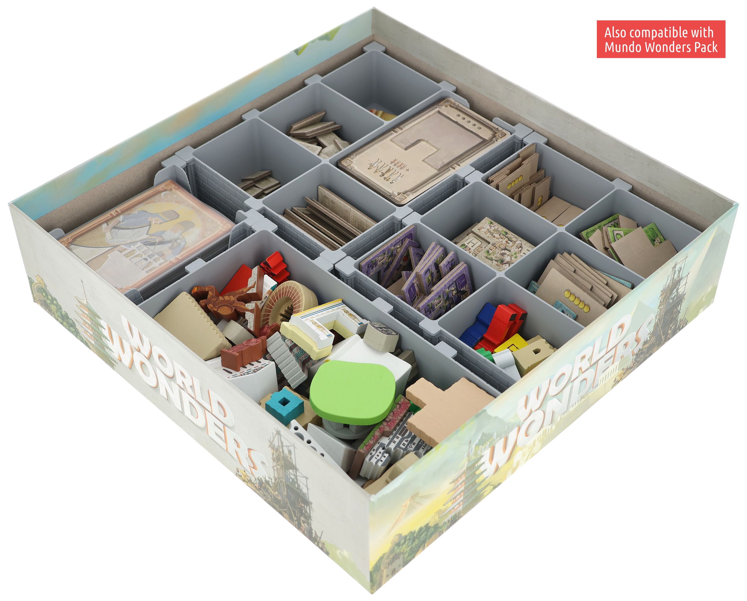 • It provides space for all the game components of the core game. There is also space for the game material from the “Mundo Wonders Pack”.