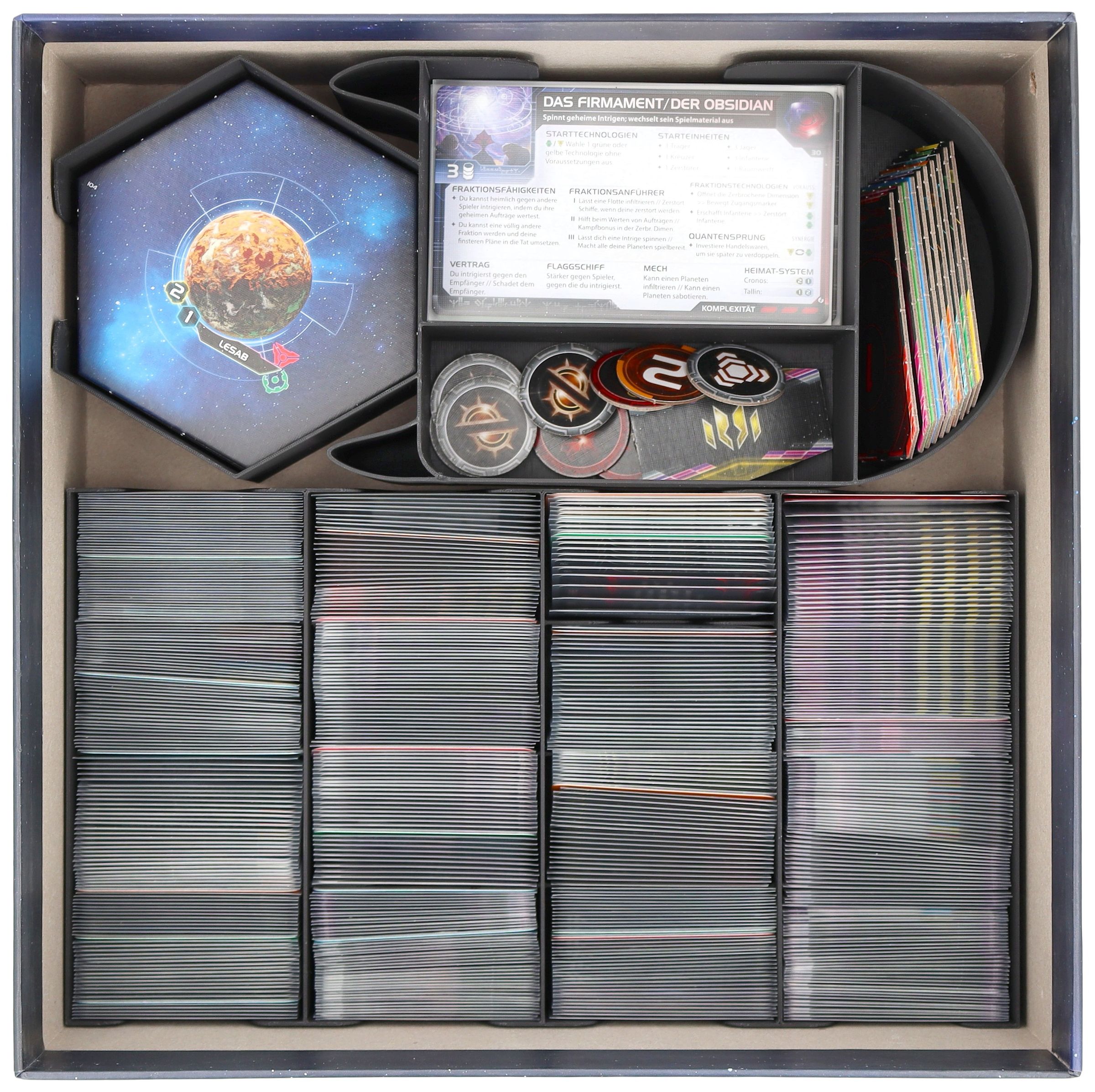- The Organizer, made of sturdy plastic and accompanied by a high-quality foam tray, fits perfectly into the board game box of Twilight Imperium: Thunder's Edge (insert dimensions: 285 x 285 x 120 mm).