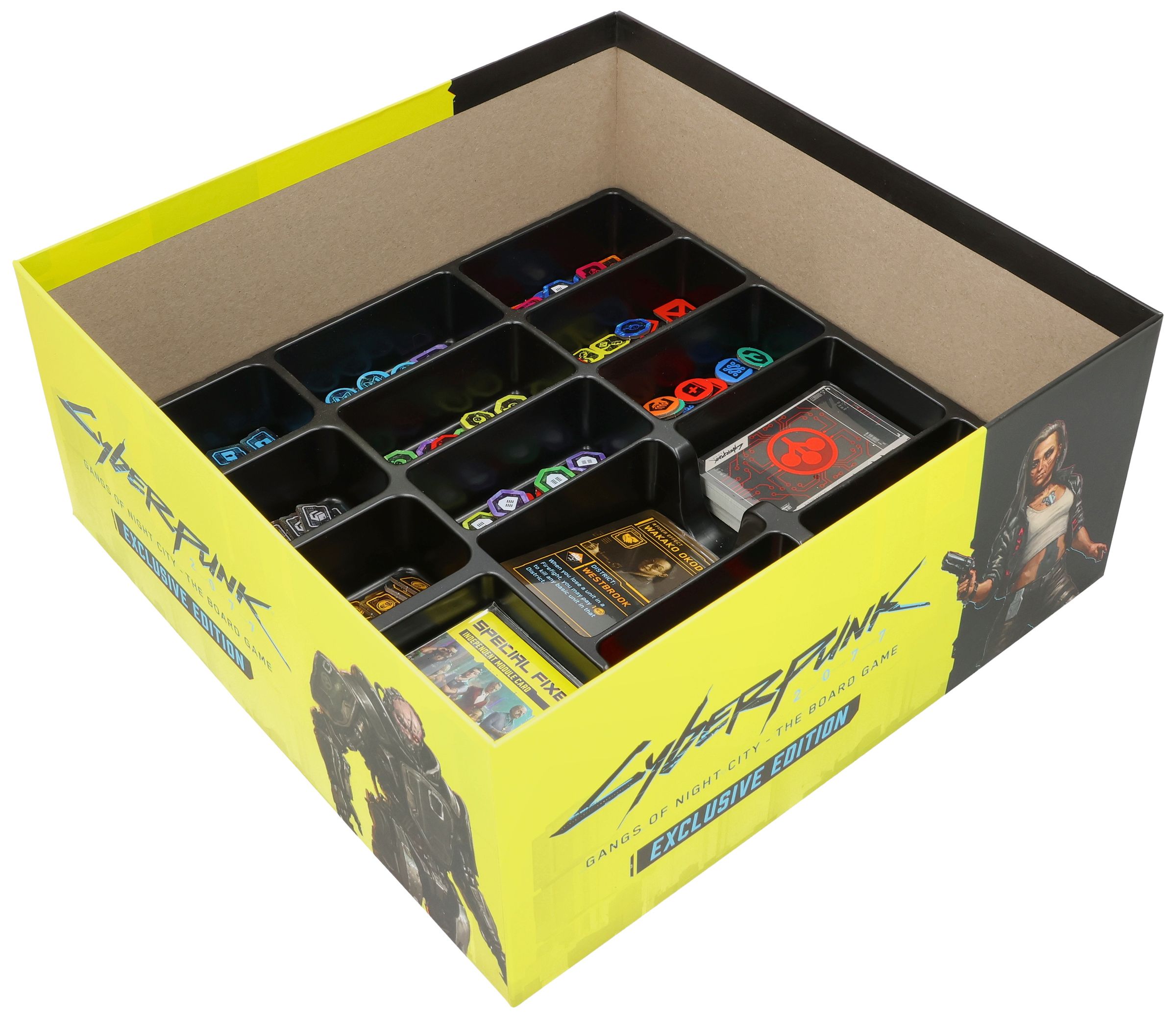 In Night City, the gangs rule and only the strongest survive. To make sure you're fully prepared, this Feldherr Bundle offers a thoughtful combination of a customized foam insert for the board game box and an additional storage box with more inserts for the game content from the Kickstarter expansions of Cyberpunk 2077: Gangs of Night City - The Board Game.