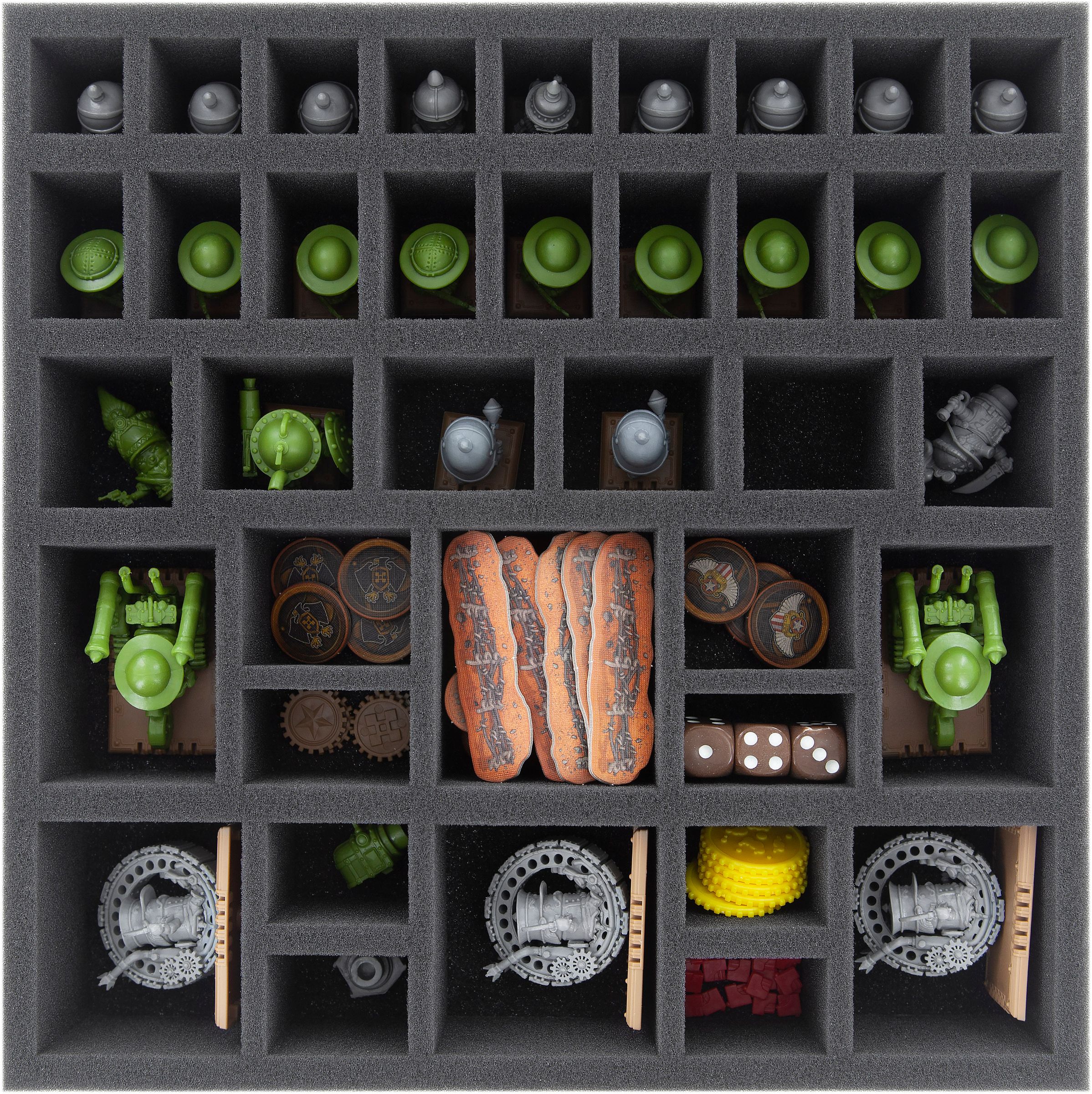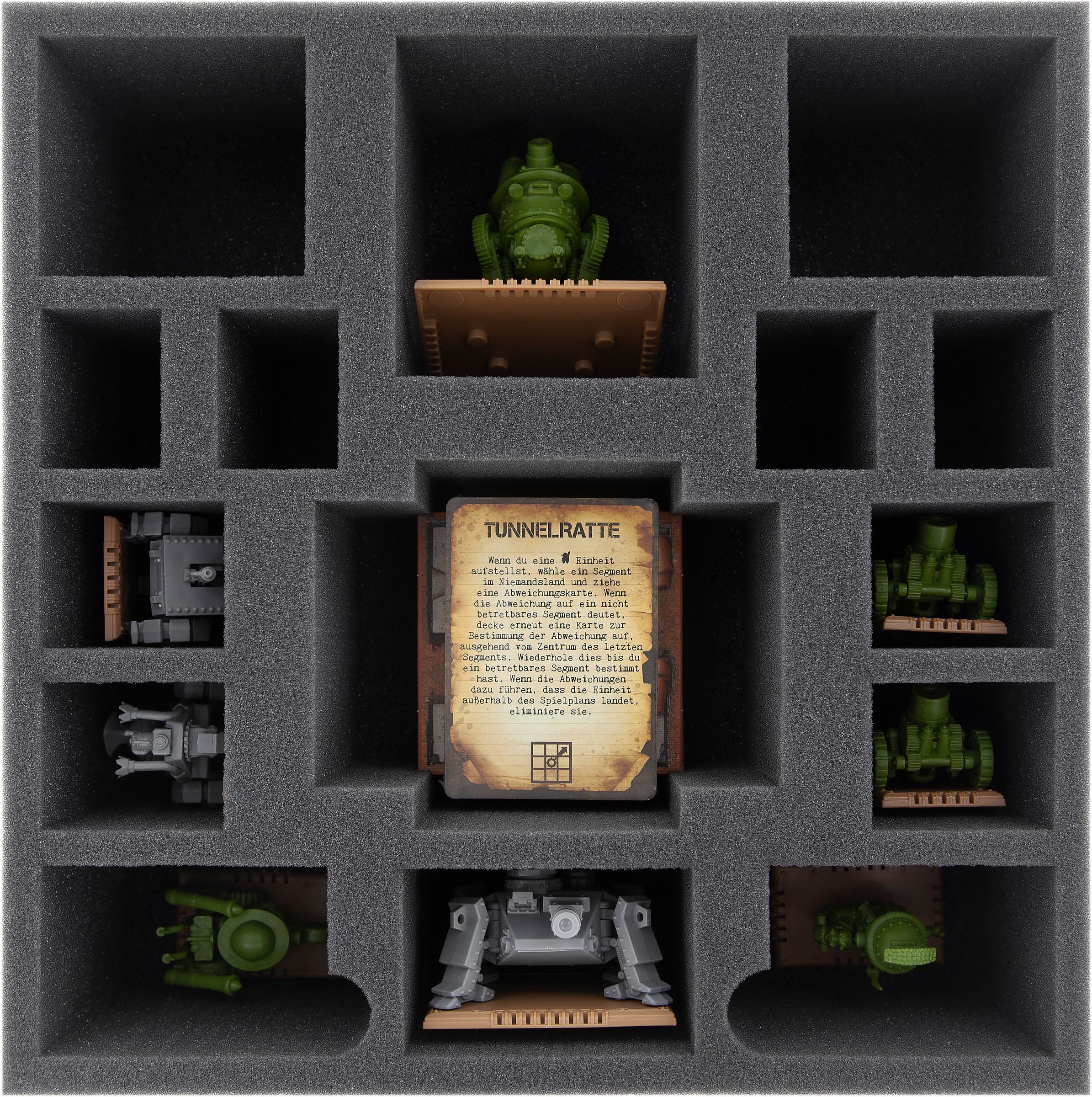The foam tray with the 15 compartments will hold the large miniatures like MT-1 Ostrich and Sturmpanzer. In addition, the tray will accommodate medium-sized figures like e. g. MG08 Schlitten and Hammer 65 Pounder. (Sleeved) cards as well as bunker- and strategic objectives markers can be stored in the large compartment in the center of the tray.