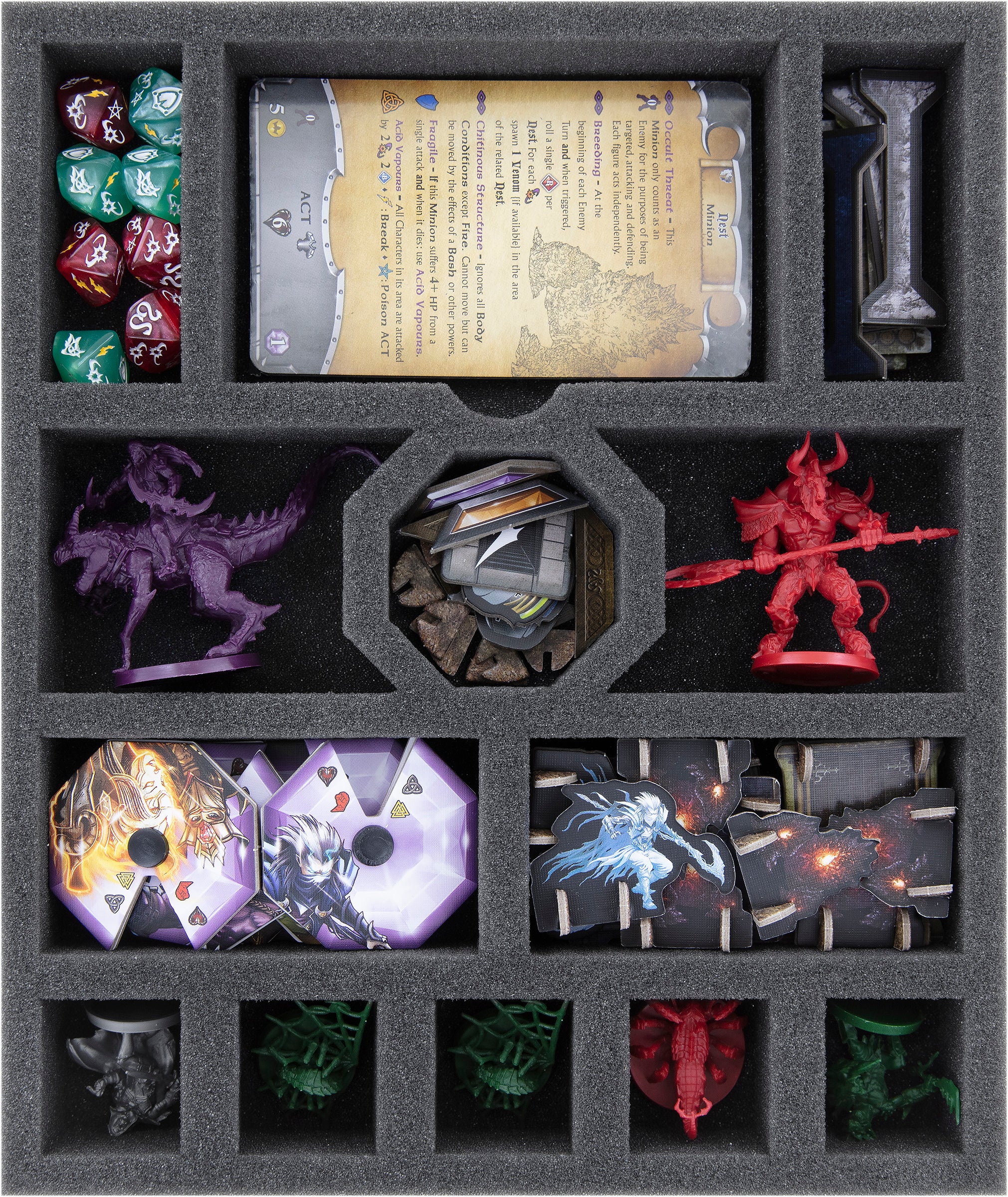 • 1 foam tray with 13 compartments for miniatures, dice, tokens, cardboard standups, Soul Gems and large-sized cards.