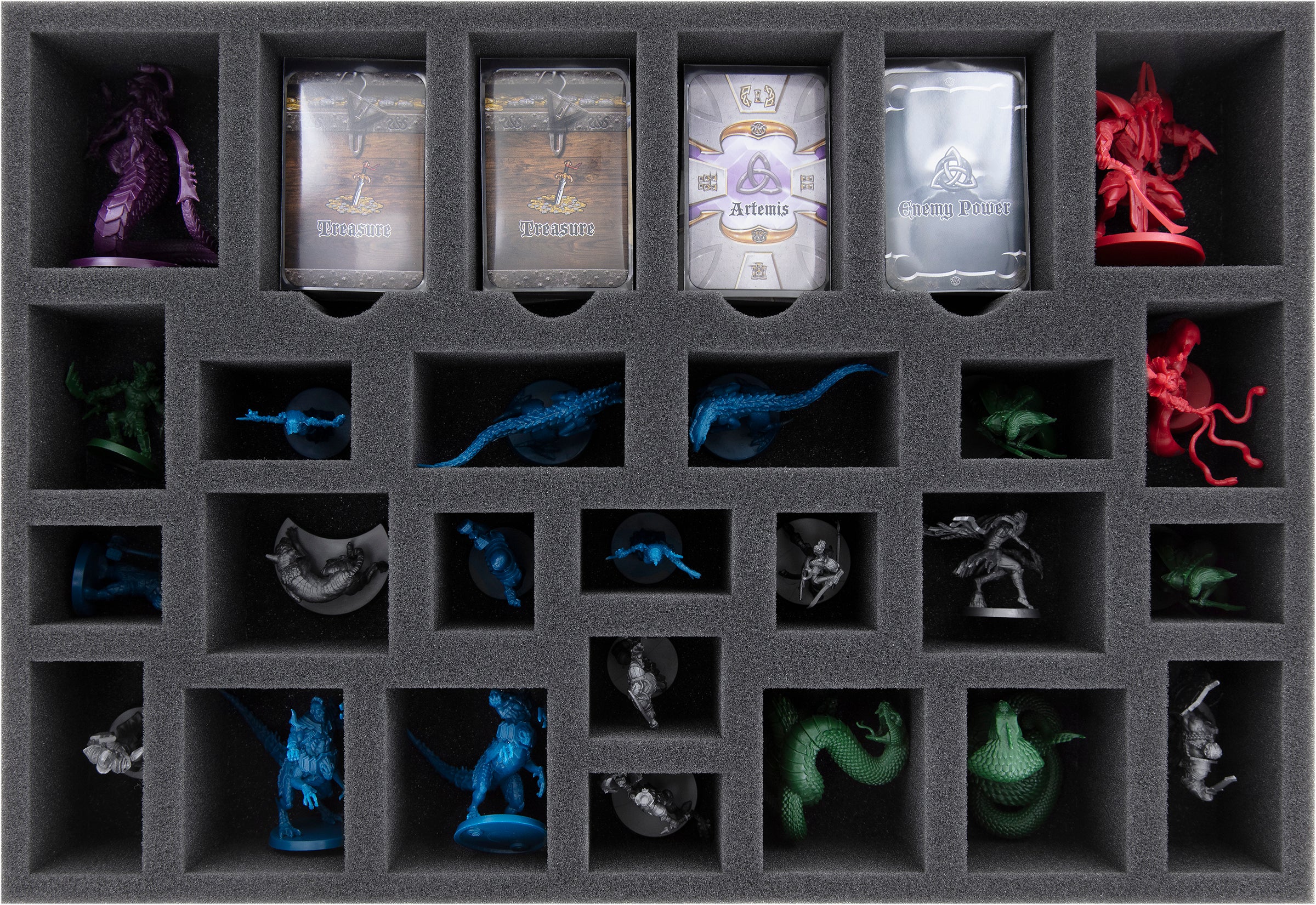 Whether hero or master enemy figure, each miniature receives a custom-fit compartment in the two foam inserts. Thanks to these, the miniatures have a tight fit. Even if it should be a little bumpier during transport, they do not slip and remain in place.