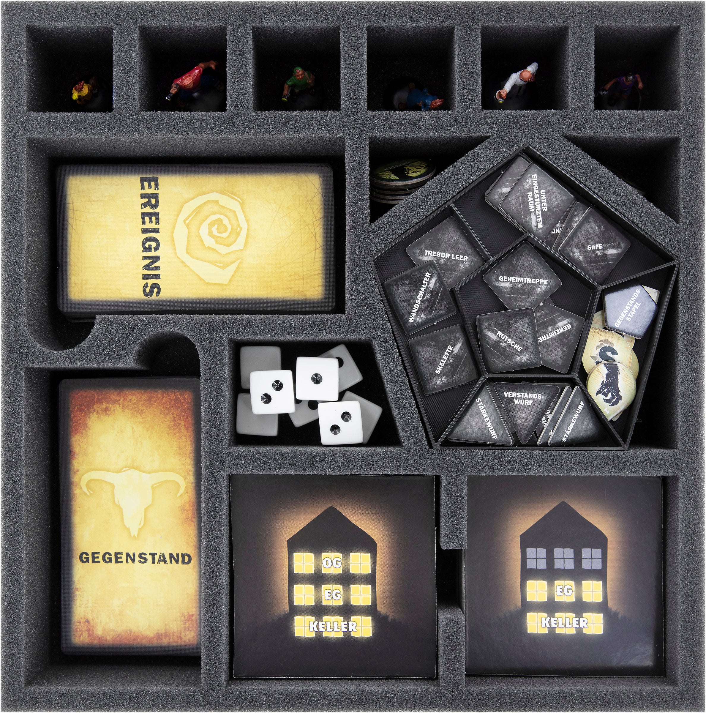 - 1 foam tray with 14 compartments for miniatures + game cards like event cards, item cards, omen cards, player overview cards, traitor and monster overview cards + small-sized game components like room tiles, token, dice, hexagonal character cards