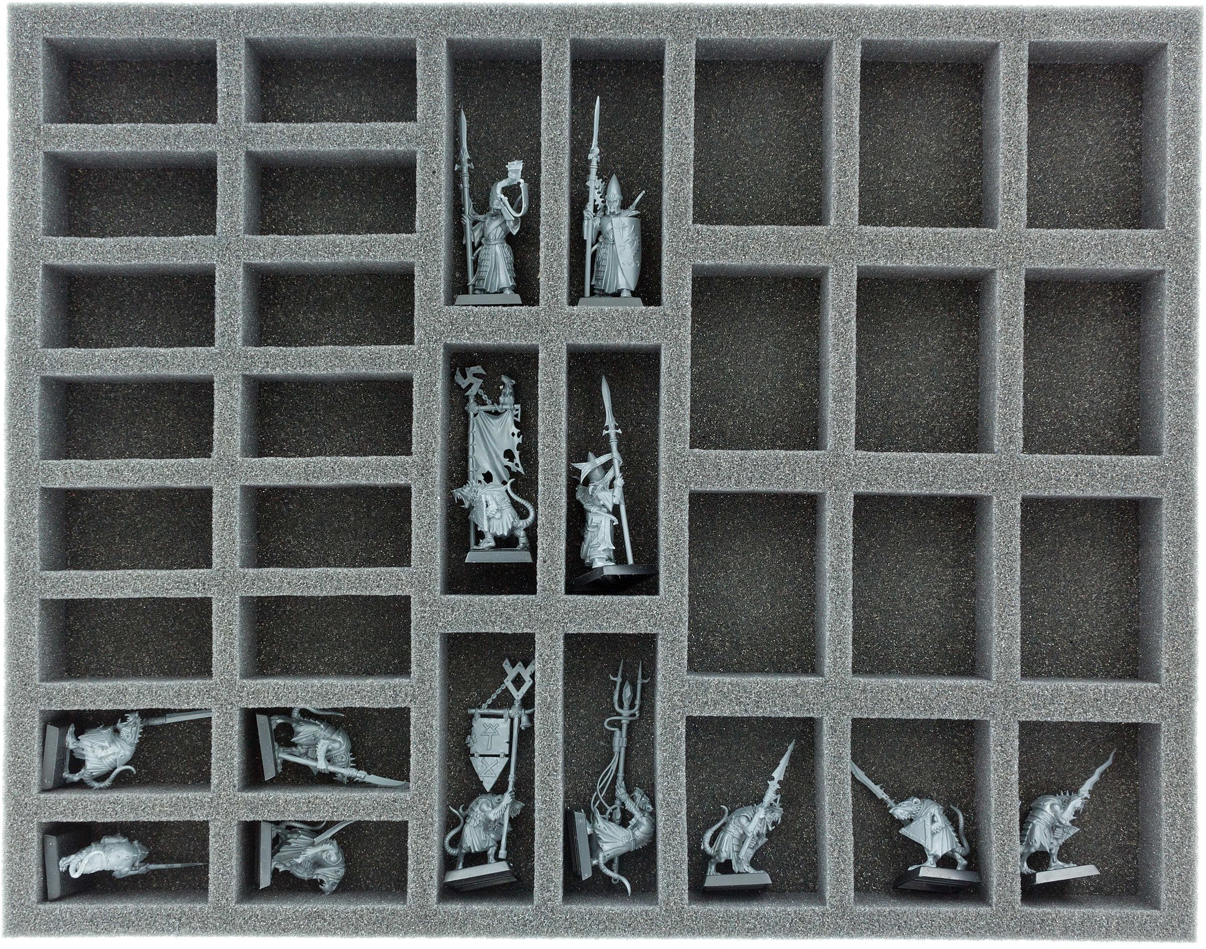 On this Full-Size foam tray, you can accommodate up to 34 different sized miniatures of the Gloomspite Gitz. There are 4 different compartment sizes - for standard models, elongated models (e.g. Icon Bearers) as well as for wider Gitz miniatures on 25 mm base.