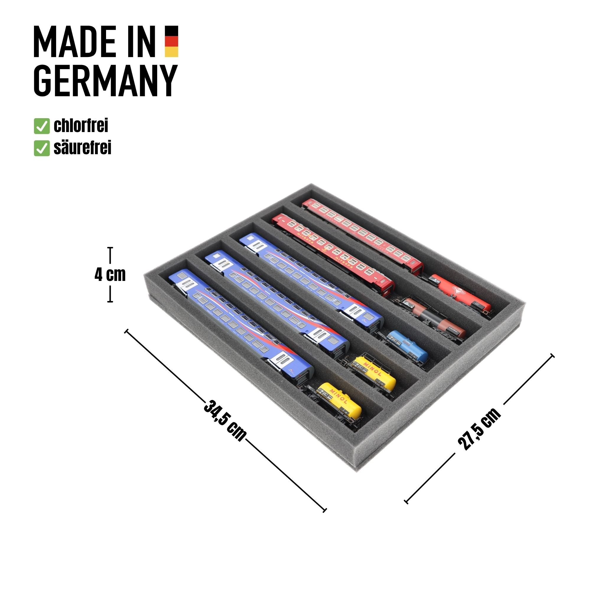 Stored properly and transported safely. With this Feldherr Full-Size foam inlay for model railways in TT Gauge your models are safe.