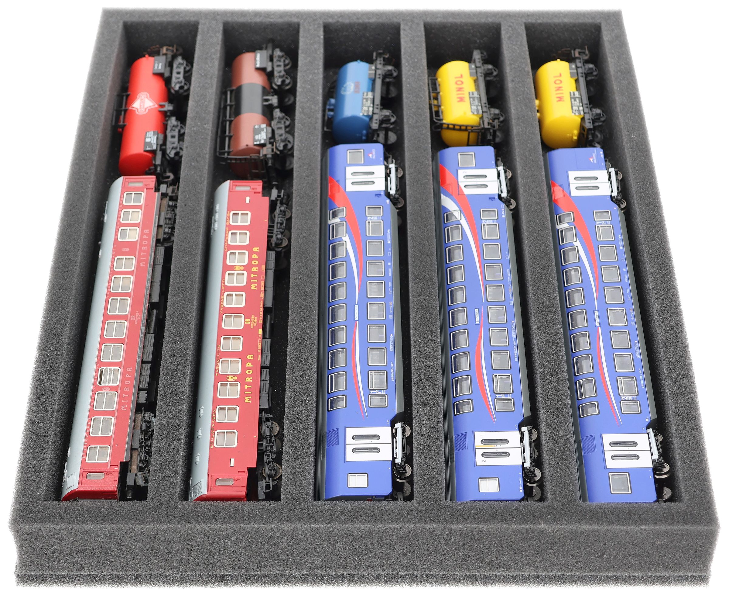 Several trains and carriages can be stored next to each other in one compartment. In order to prevent collision or unintentional coupling, we offer suitable foam spacers (HS040A003) to separate your vehicles.