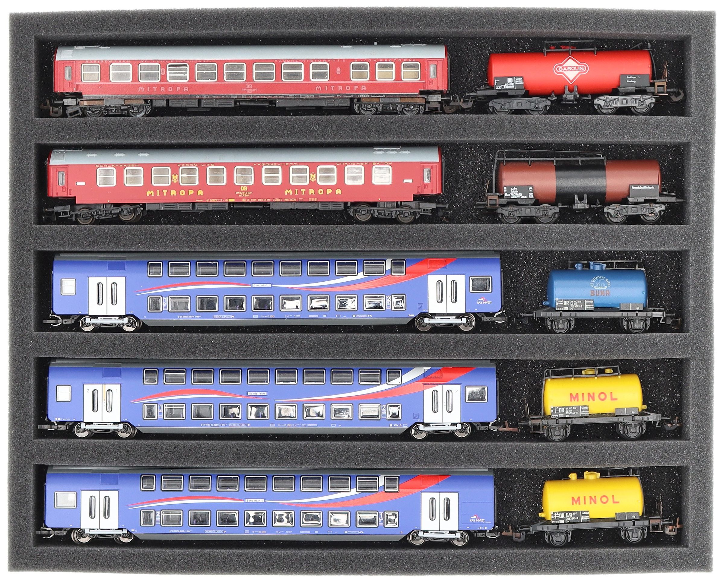 FS040A002 Foam inlay TT Scale - horizontal - 5 slots for model railway locomotives, wagons, and vehicles