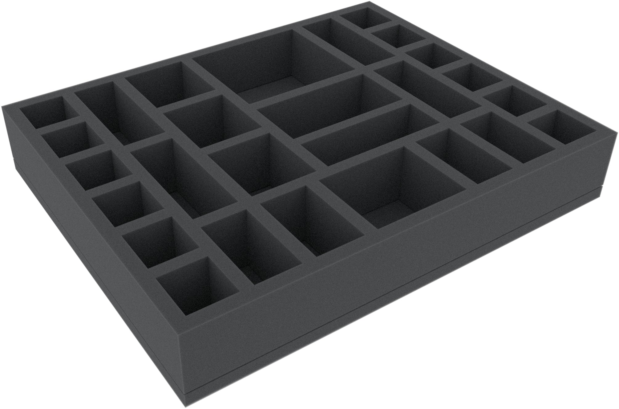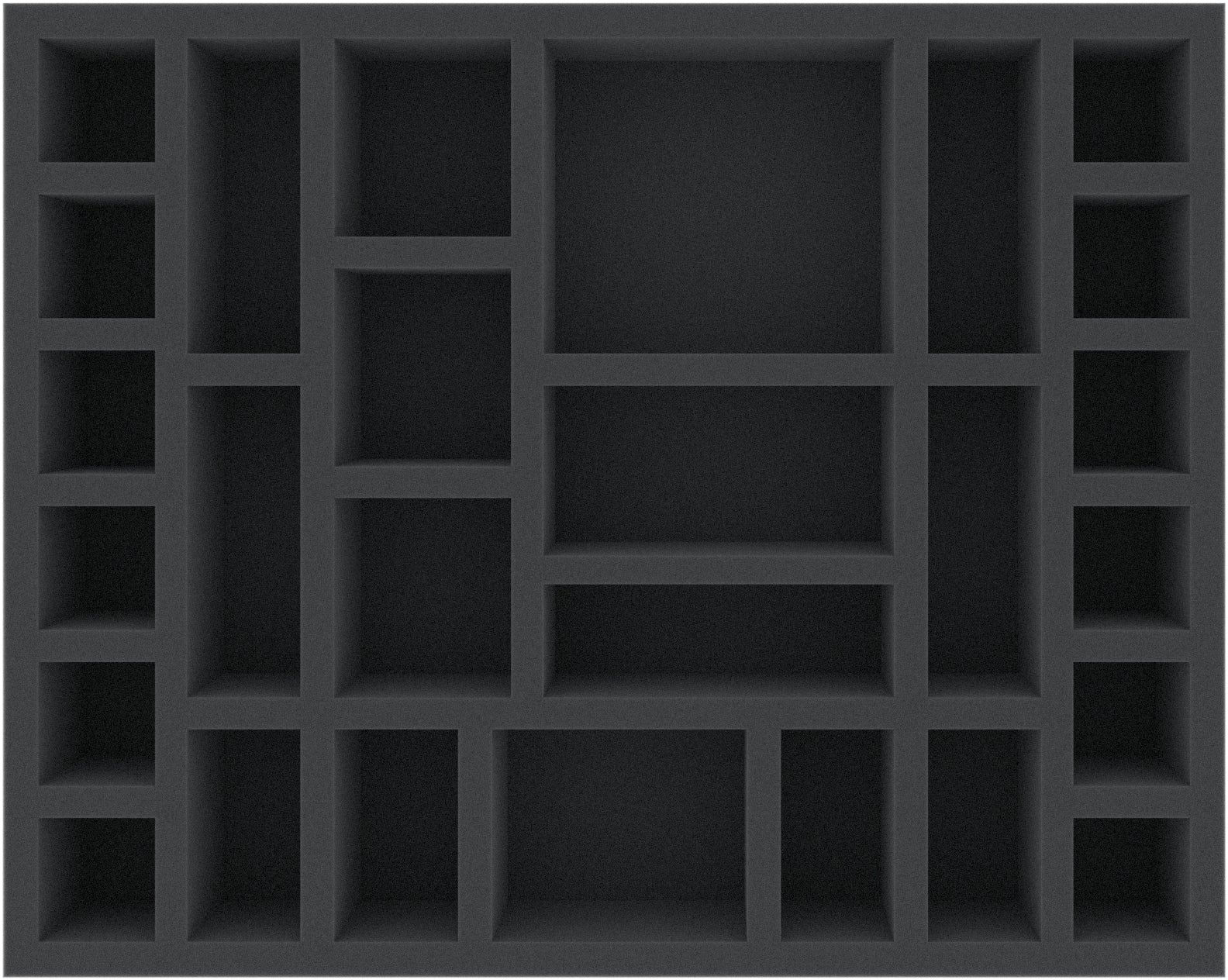 This Feldherr Full-Size foam tray provides safe space for up to 27 miniatures from Dark Souls - The Board Game. The different sized compartments are ideal for safe storage of medium size figures such as Pursuer and Mimic. Just like for figures from the Characters, Phantoms and Explorers expansions (e.g. Sorcerer, Thief, Oliver the Collector), as well as the small Barrels and Treasure Chests.