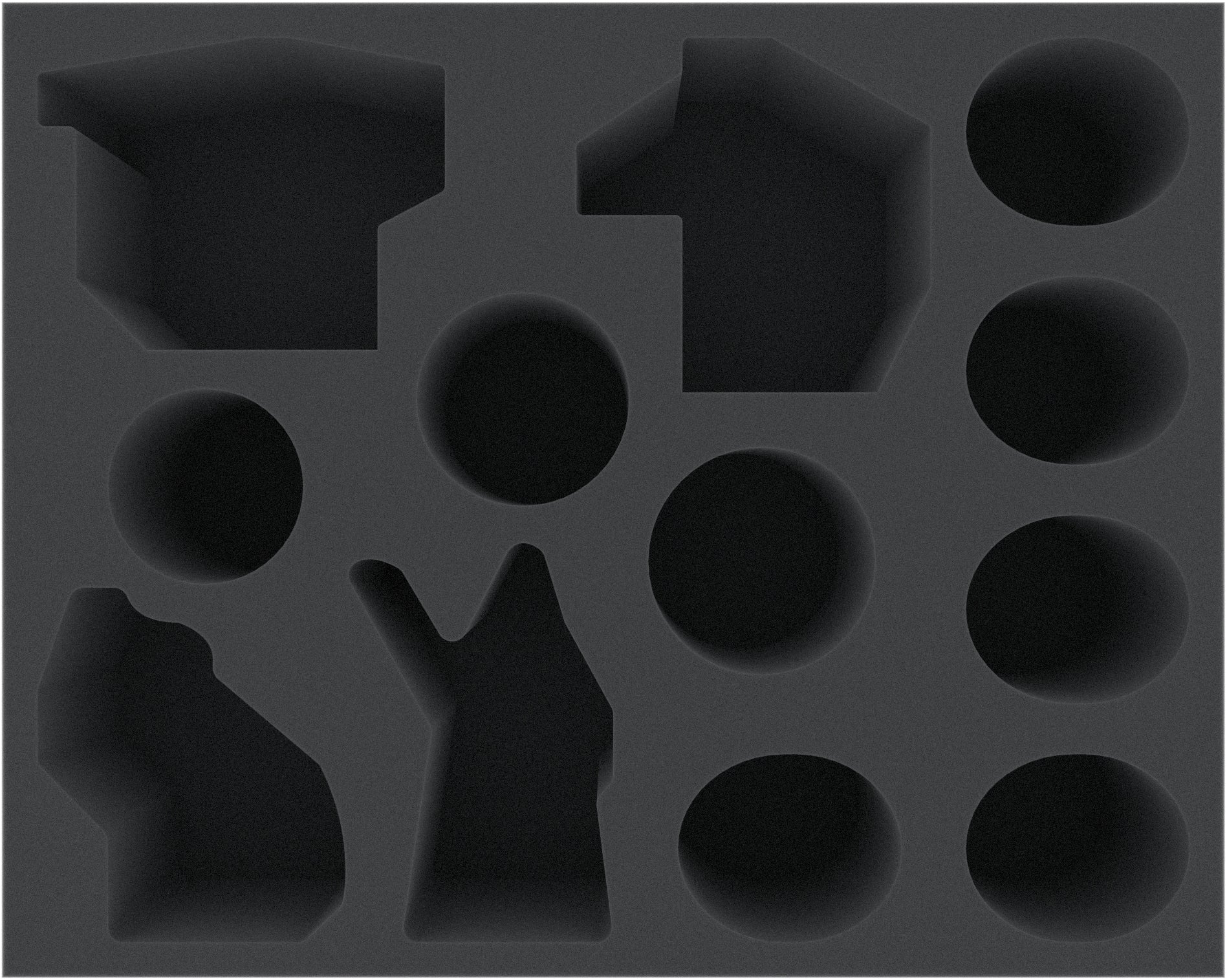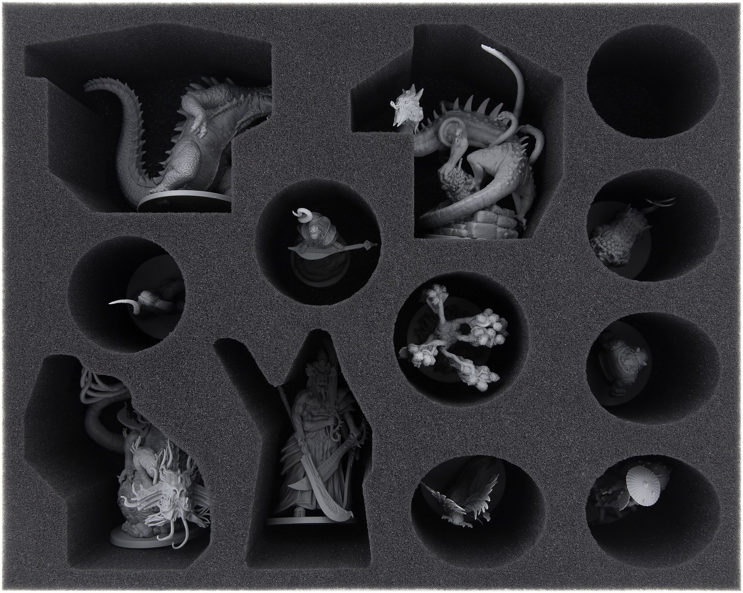 This foam tray allows you to store up to 12 Rising Sun Kickstarter Pledge Monsters. Four custom cut compartments accommodate the big monsters Daikaiju, Fire Dragon, Earth Dragon and Oni of Plagues. Eight additional, round compartments will hold smaller miniatures like Phoenix oder Jinmenju.