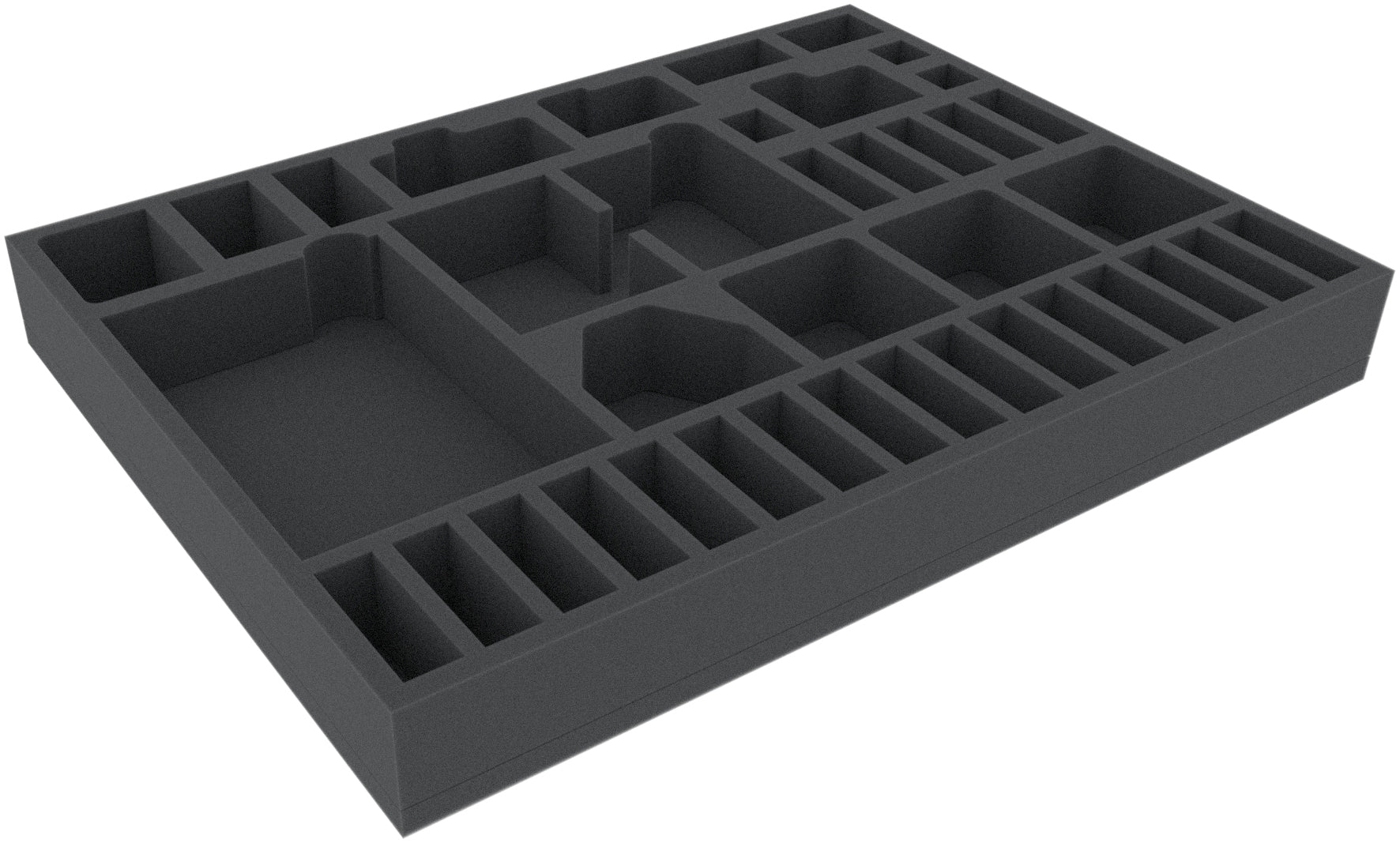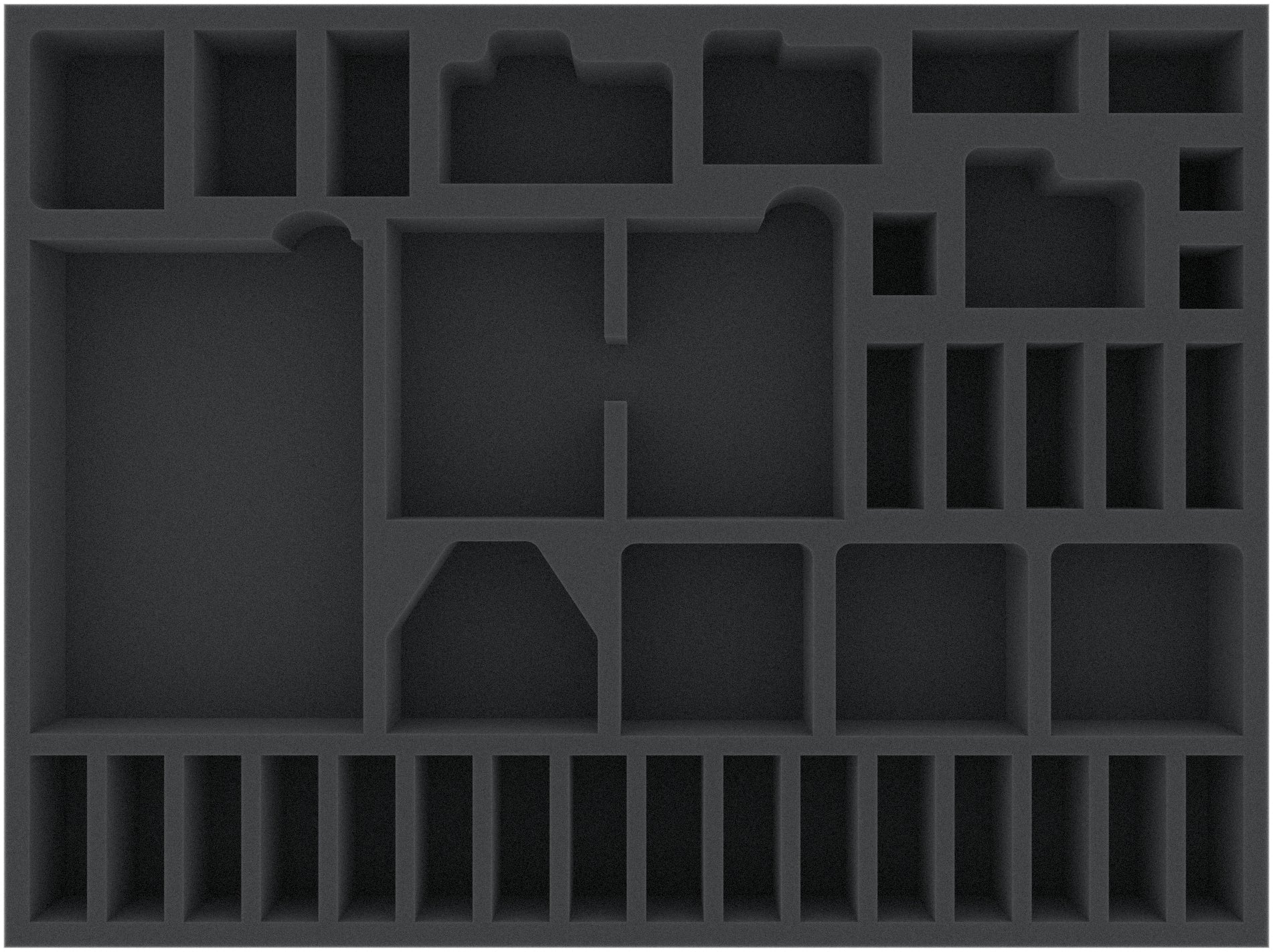 This 45 mm high foam tray is divided into 39 compartments. It is particularly suitable for the safe storage of tabletop and board game miniatures, as well as other fragile models and small parts.