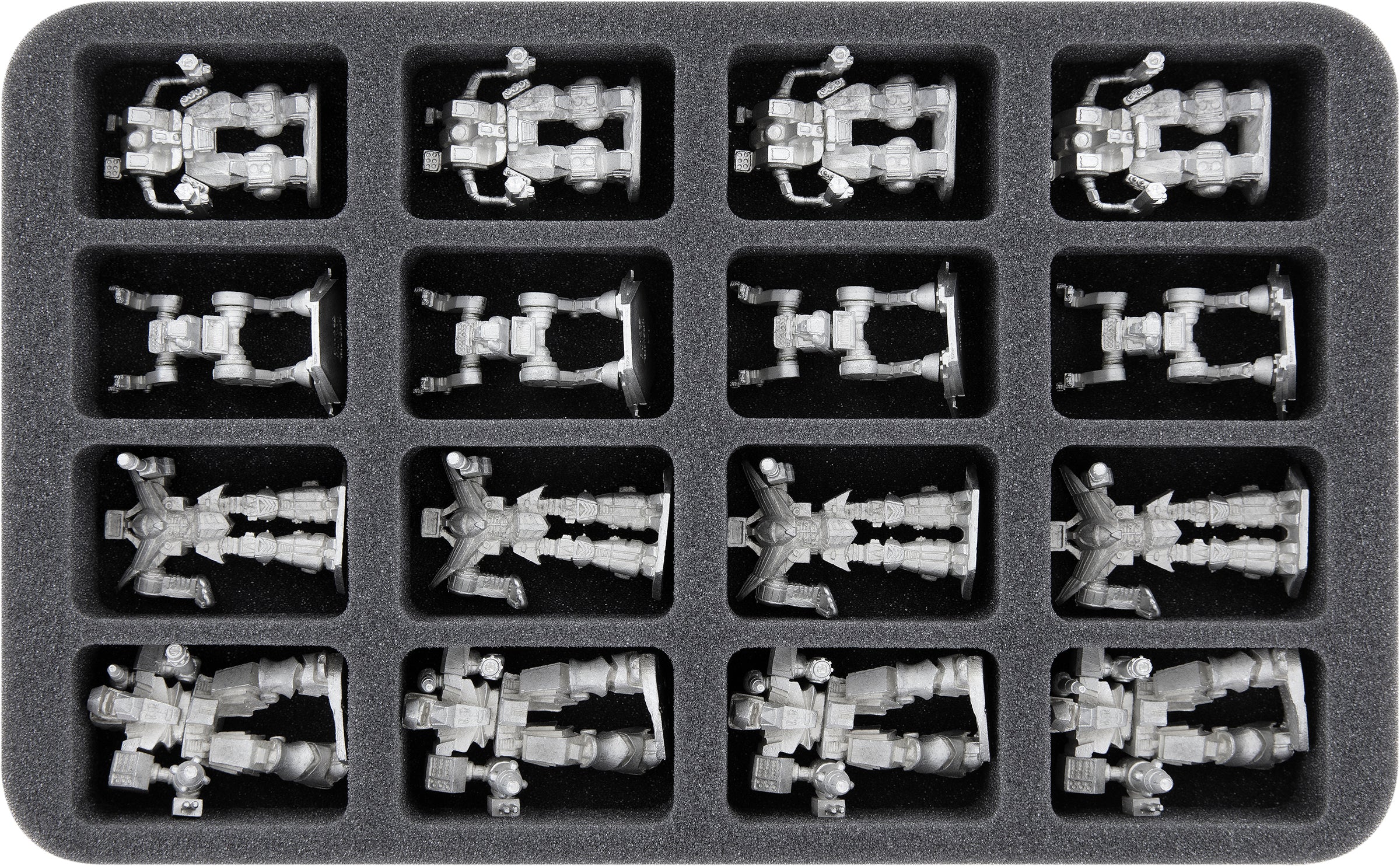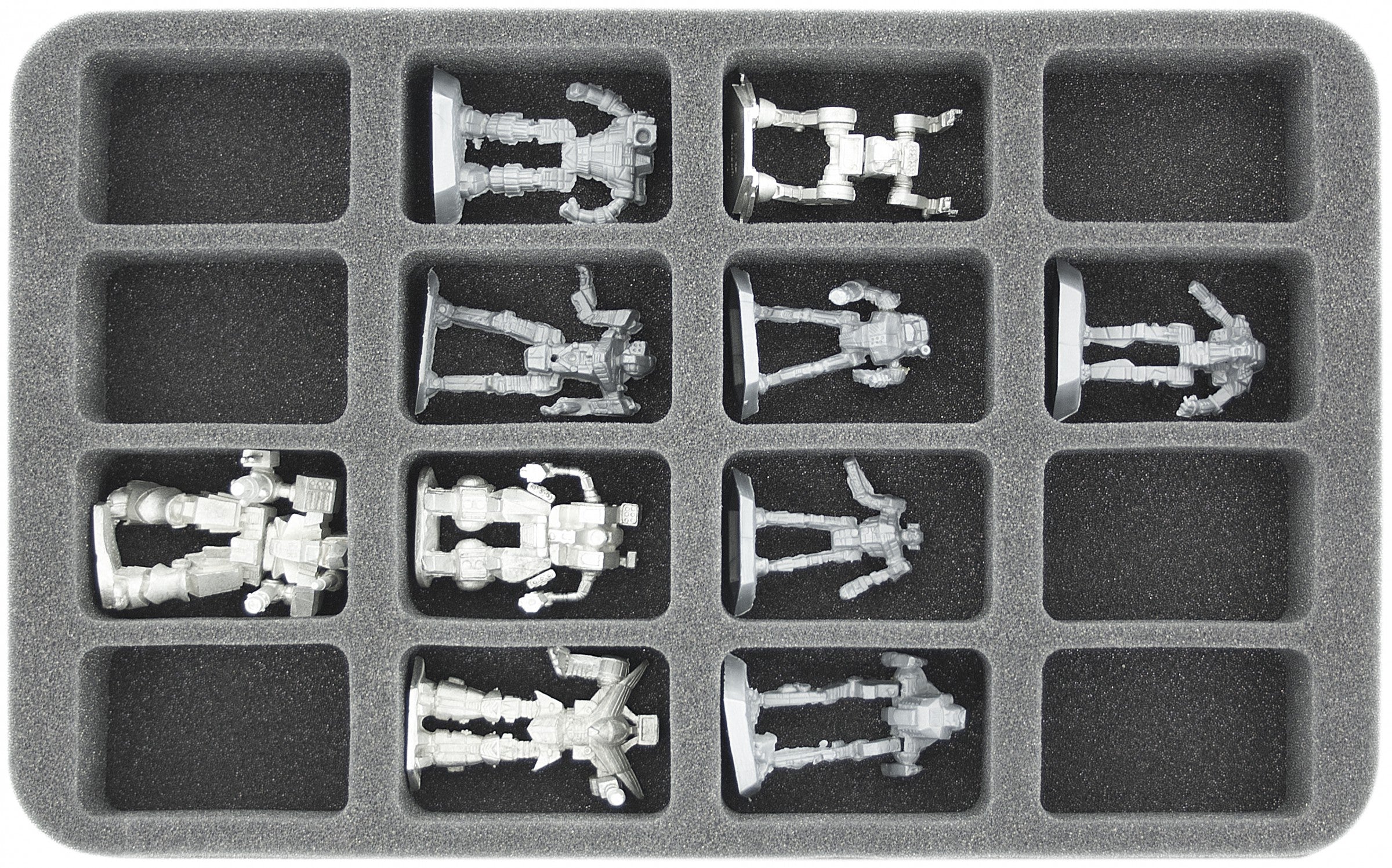 The 16 identical compartments are ideal for small and medium-sized Mechs like Piranha and Archer or miniatures of similar size.