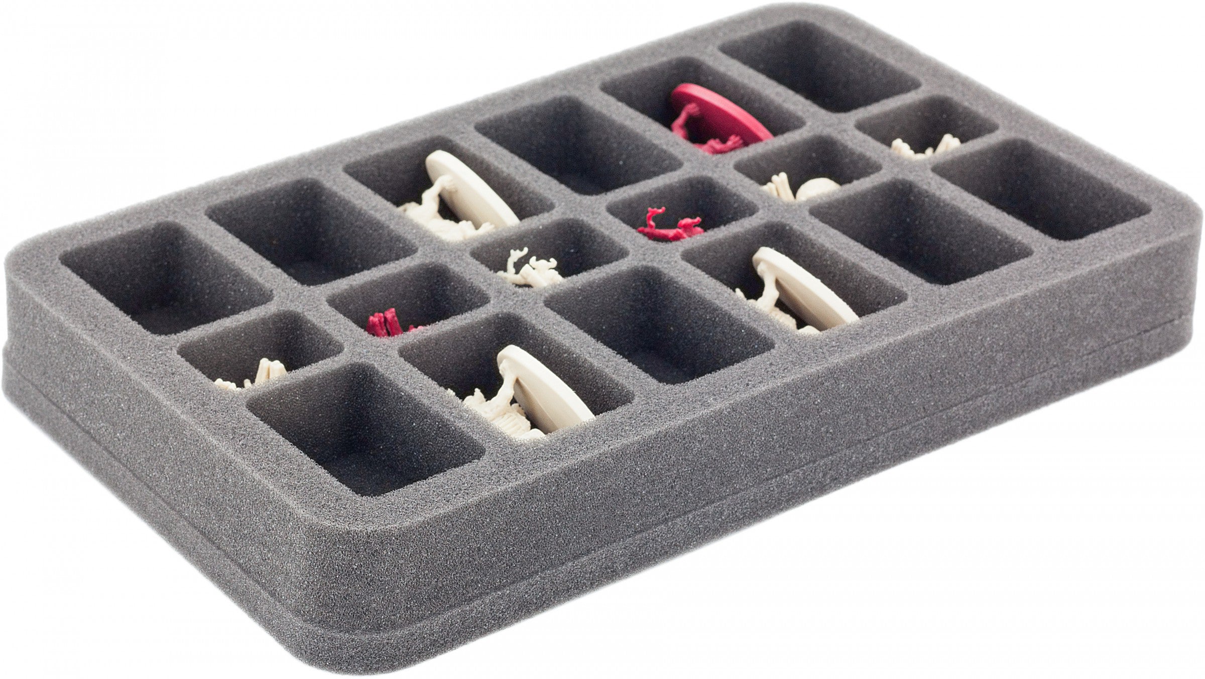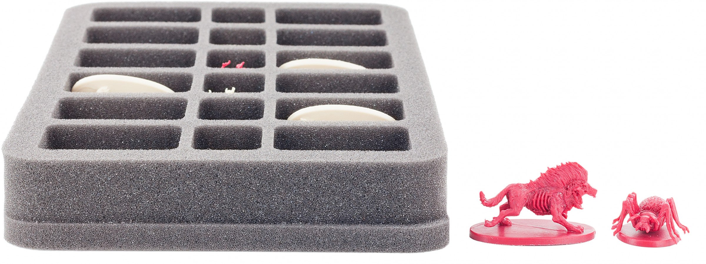 Jest on podzielony na 18 przedziałów. 12 z nich ma wymiary 54 mm x 35 mm x 25 mm wysokości i idealnie nadaje się do miniatury Descent o wydłużonej podstawie, takiej jak Barghesty. W środku znajduje się sześć kolejnych 27 mm x 35 mm przedziałów o tej samej wysokości. Na przykład Goblin Archers i Cave Spiders będą się tu czuć swobodnie. Podstawa z pianki o grubości 10 mm zabezpieczy miniatury od dołu. Łączna wysokość tacy wynosi 35 mm.