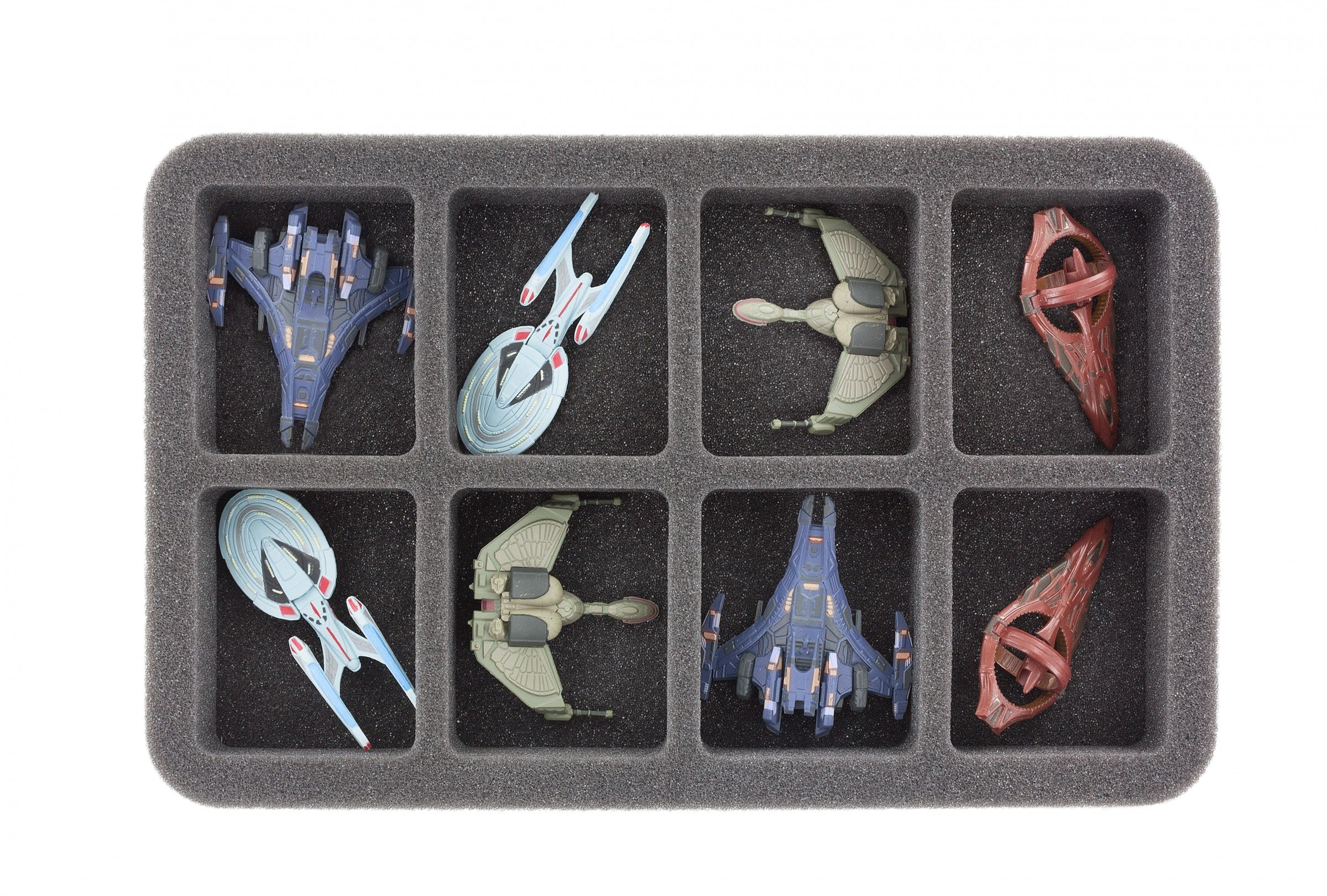 Specjalnie dostosowana taca piankowa na 8 dużych statków typu Wizkids Star Trek Attack Wing! Gotowy do użycia - klejona podstawa z pianki o grubości 10 mm. Głębokość pianki wynosząca 35 mm wynika z 10 mm podstawy pianki i tacy szczelinowej z 25 mm głębokość efektywna.