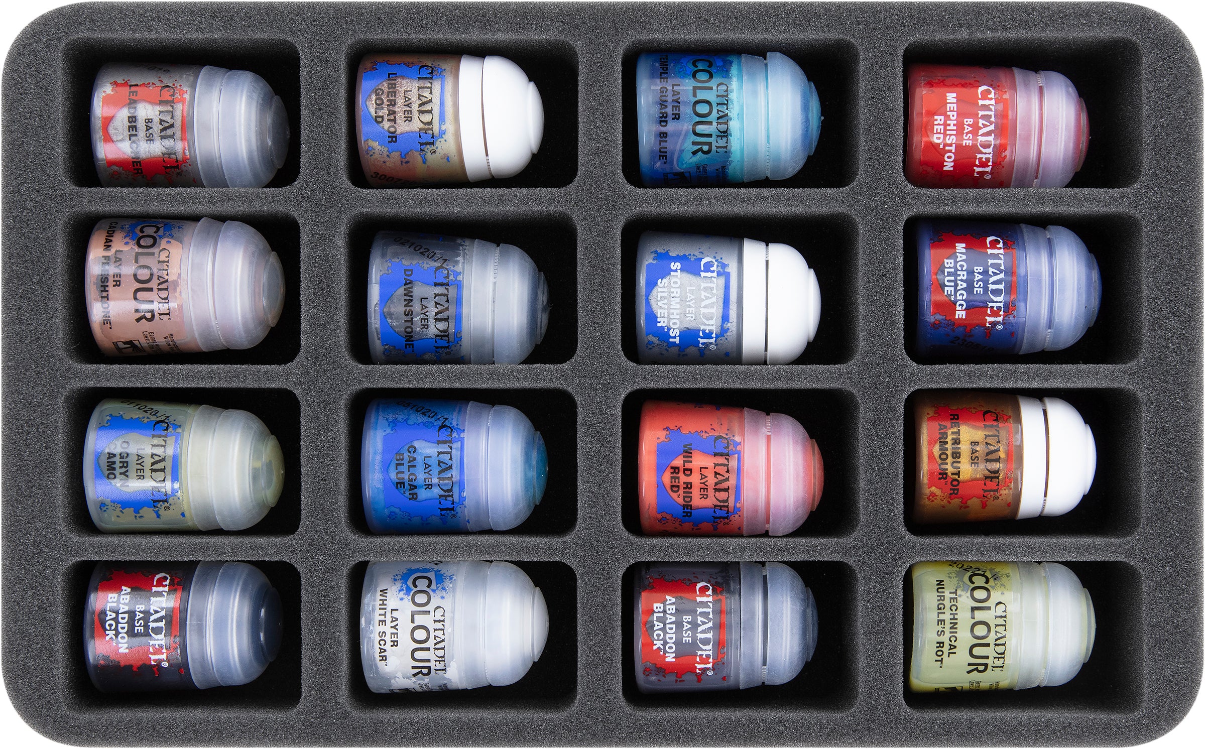 The foam insert provides space for up to 16 Citadel paint pots with 12 ml, 18 ml, or 24 ml capacity.