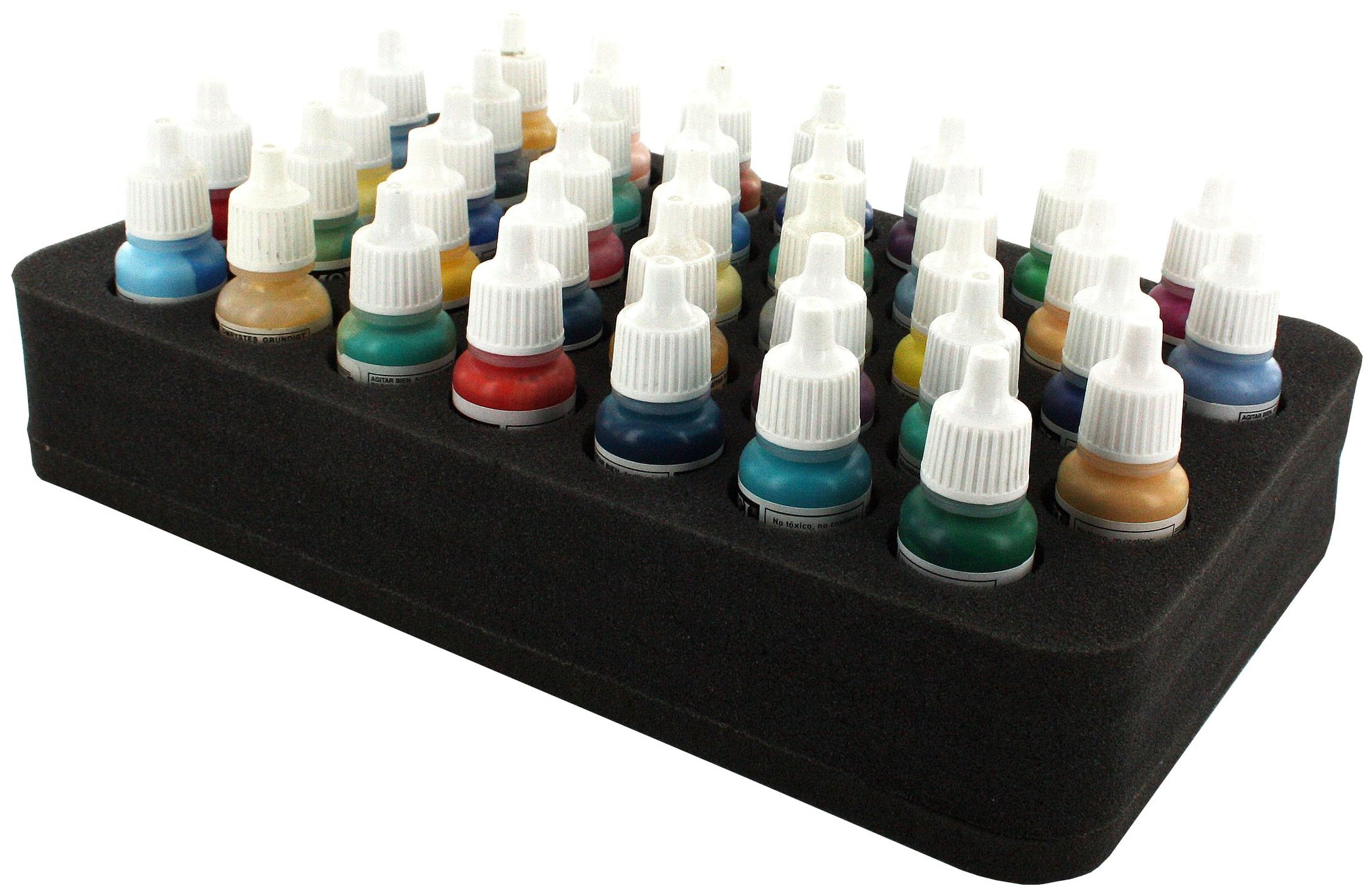 Up to 37 model color bottles can be stored here in a clearly arranged and transportable way. Thanks to the lightweight material, the foam insert is a wonderful addition to your hobby bag.