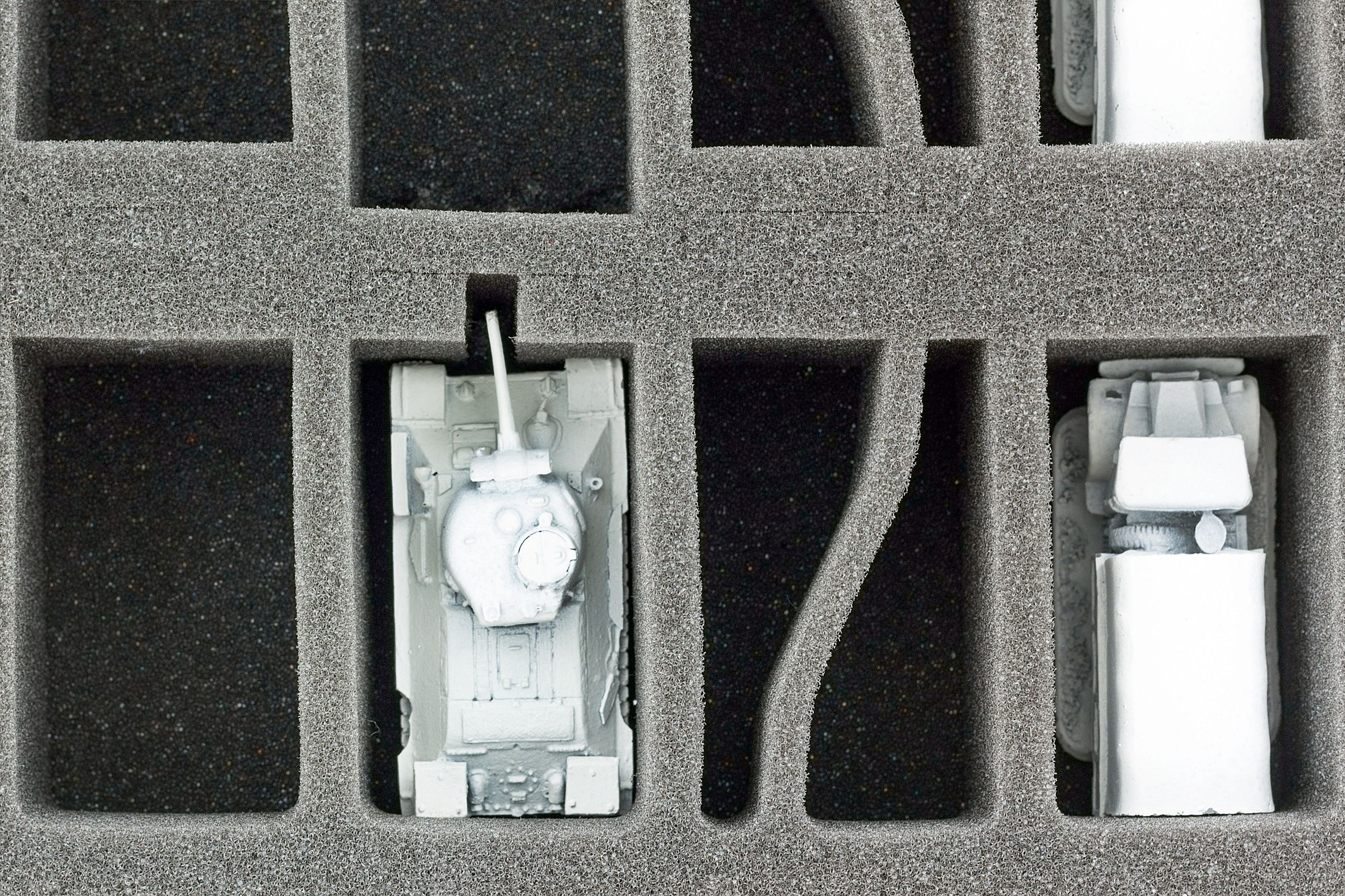 Specjalna taca na pianę do wszystkich płomieni graczy wojennych (FoW)! Taca mieści 8 czołgów i wieżyczki strzelnicze. Gotowa do użycia - klejona podstawa z pianki 10 mm. Głębokość pianki 50 mm wynika z podstawy z pianki 10 mm i tacy z pianką szczelinową z 40 mm głębokość efektywna.