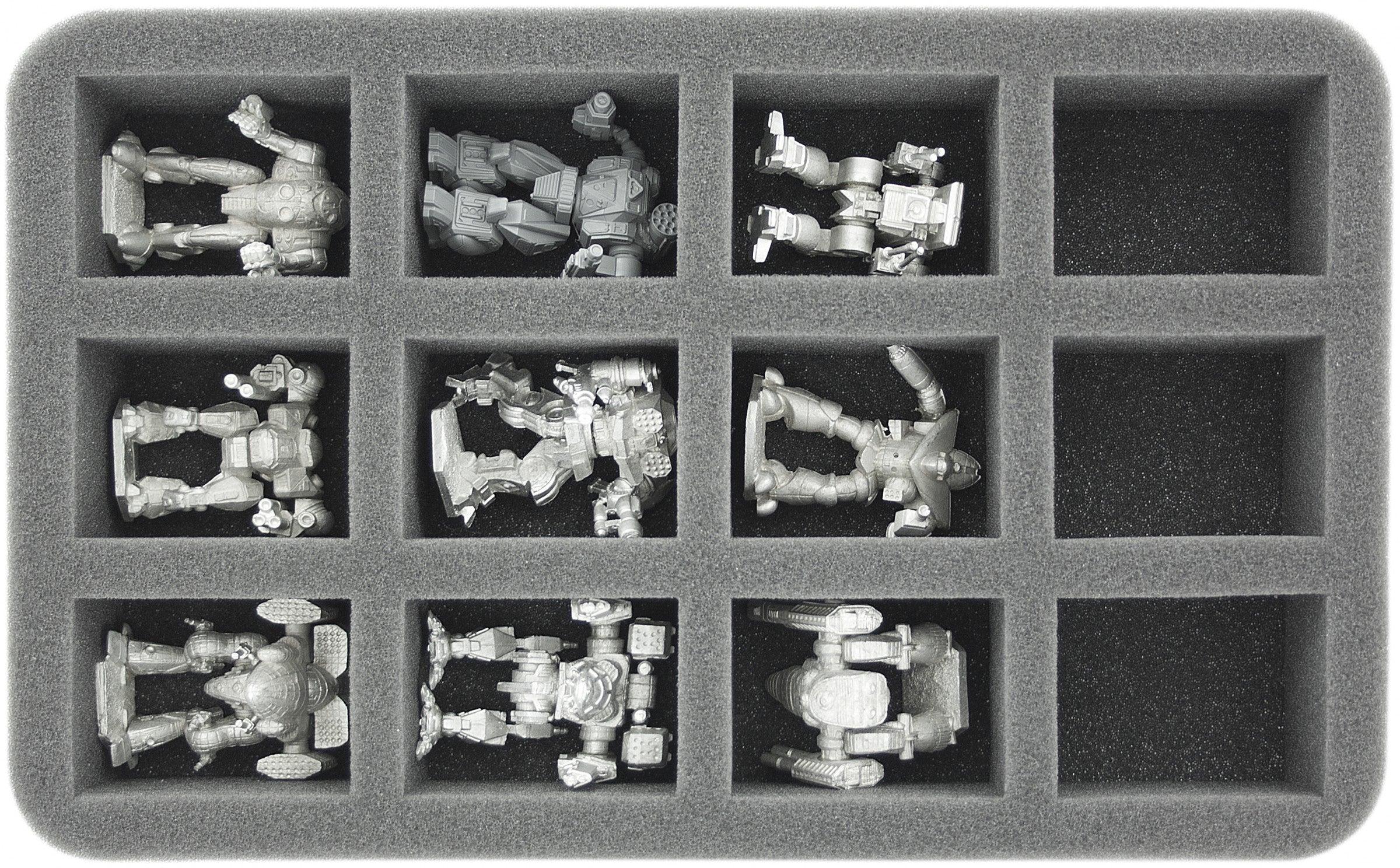 This foam tray with 12 compartments is ideal for storing a full company or 12 big BattleTech miniatures, clearly arranged and well protected.