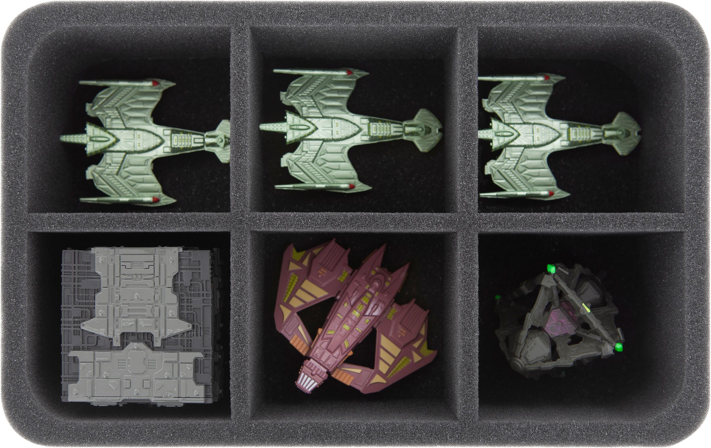 This foam tray has 6 compartments for the safe and orderly storage of larger Star Trek Attack Wing miniatures. It is ideally suited for models like e. g. Tactical Cube 138. The fine-pored foam reliably protects your miniatures from damage – fragile parts remain unharmed, surfaces remain unscratched.