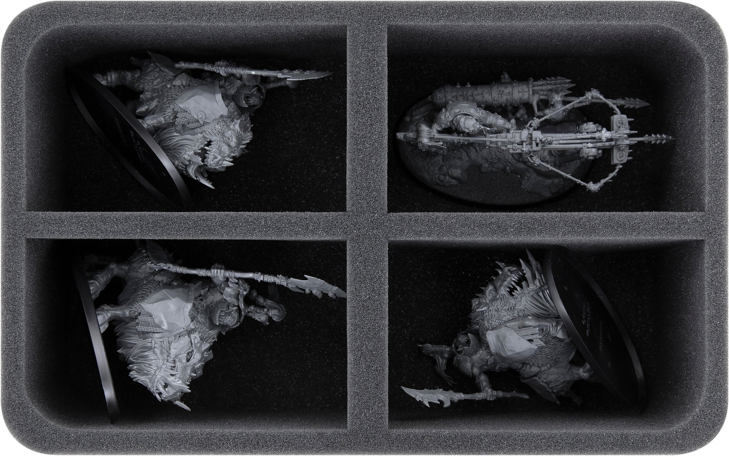 On this Feldherr foam tray you have space for up to 4 miniatures of your army. The insert is especially suitable for storing the Beast-skewer Killbow, Gore-gruntas and similar sized models.