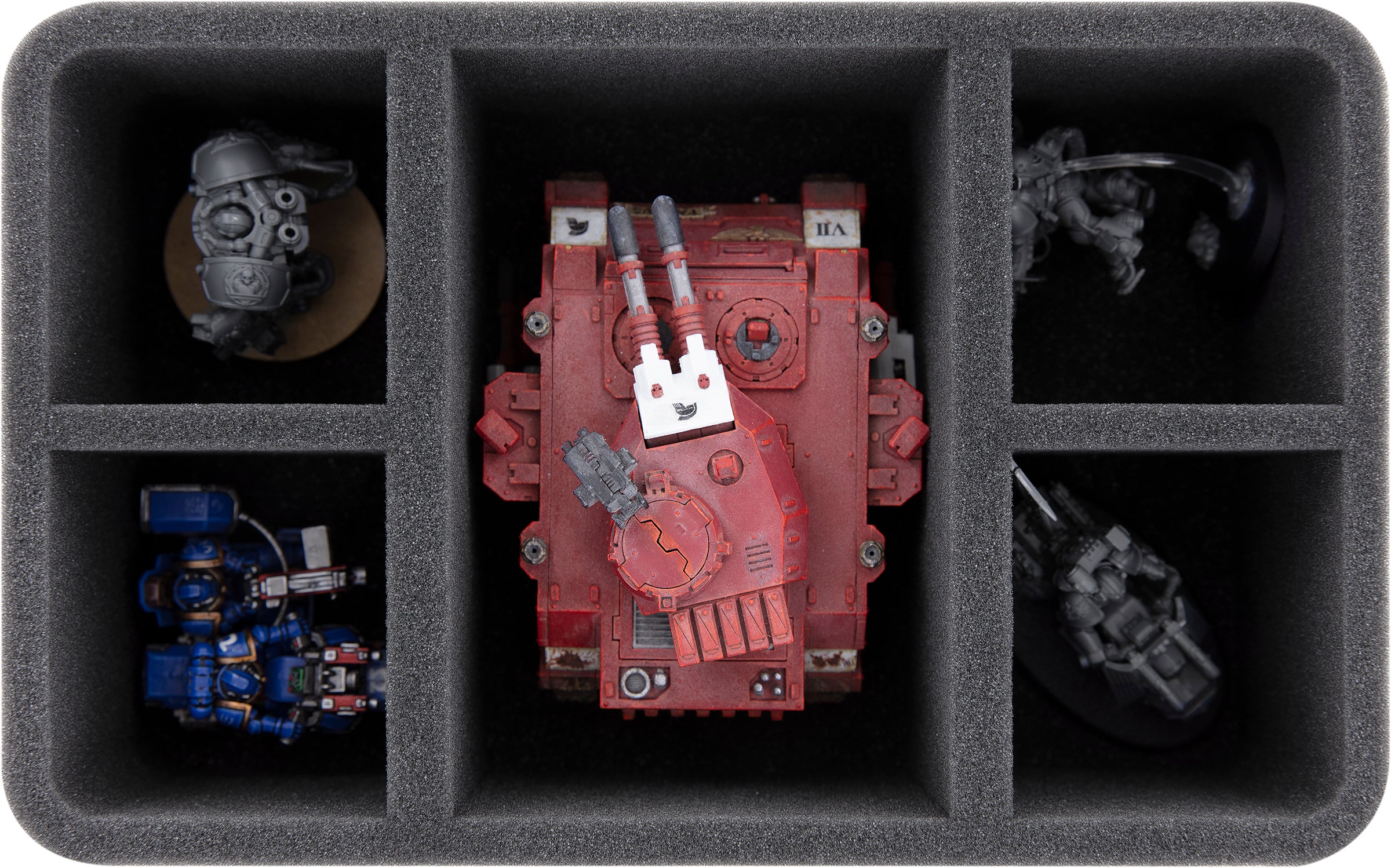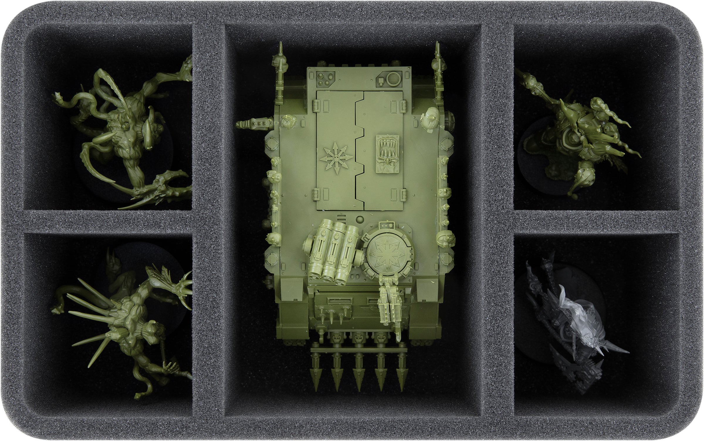 On this Feldherr foam tray you have space for up to 5 miniatures of your Death Guard army. The big compartment is particularly suitable for a Chaos Space Marine Rhino. The 4 other compartments can be used to store Deathshroud Bodyguard, Lord of Virulence, Lord Felthius and the Tainted Cohort or miniatures with similar dimensions.