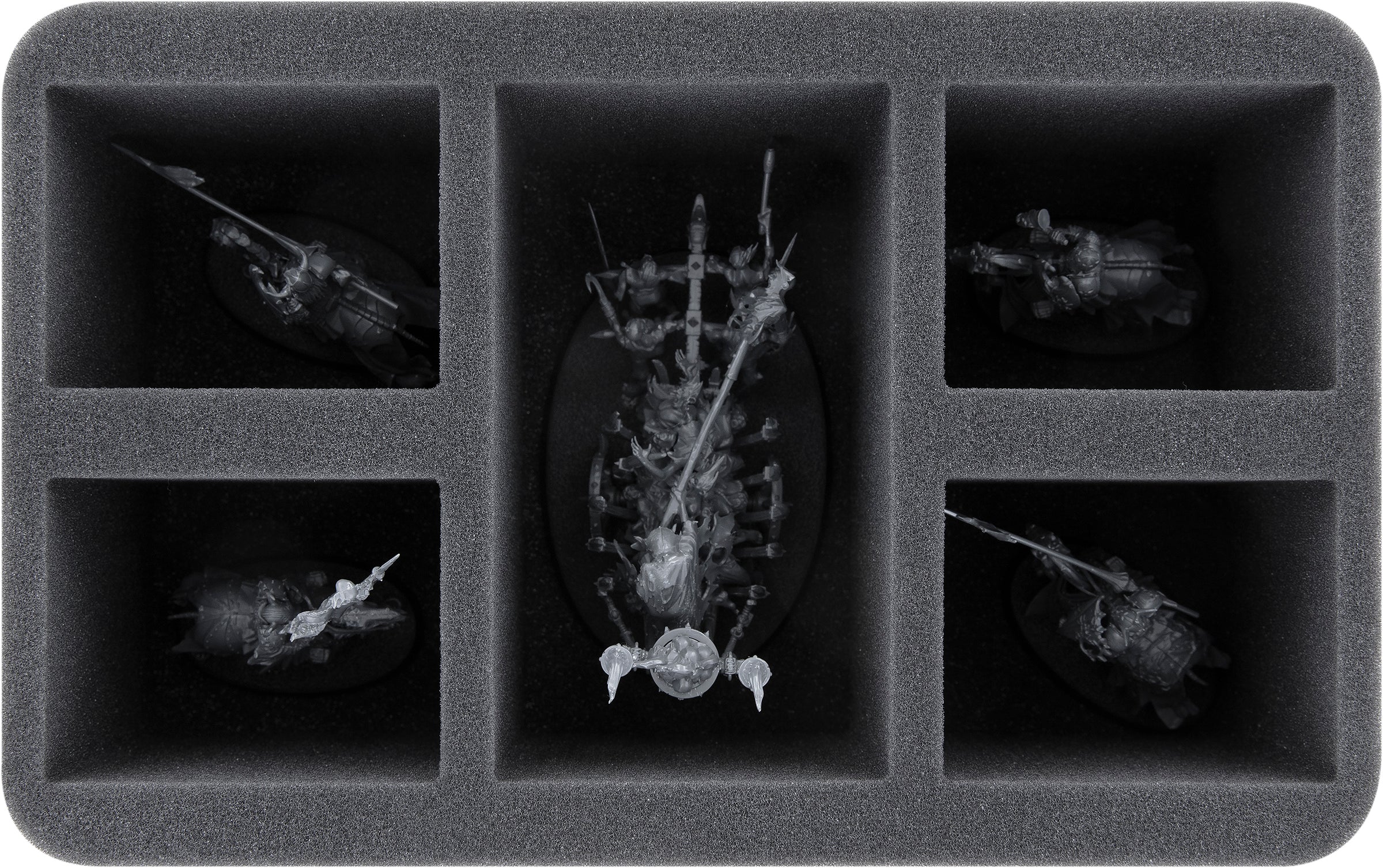 On this Feldherr foam tray you have space for up to 5 miniatures of your army. The insert is especially suitable for storing the Corpse Cart. Also fitting for the building variants with Unholy Lodestone and Balefire Brazier. The 4 remaining compartments are suitable for Blood Knights and similar sized models.