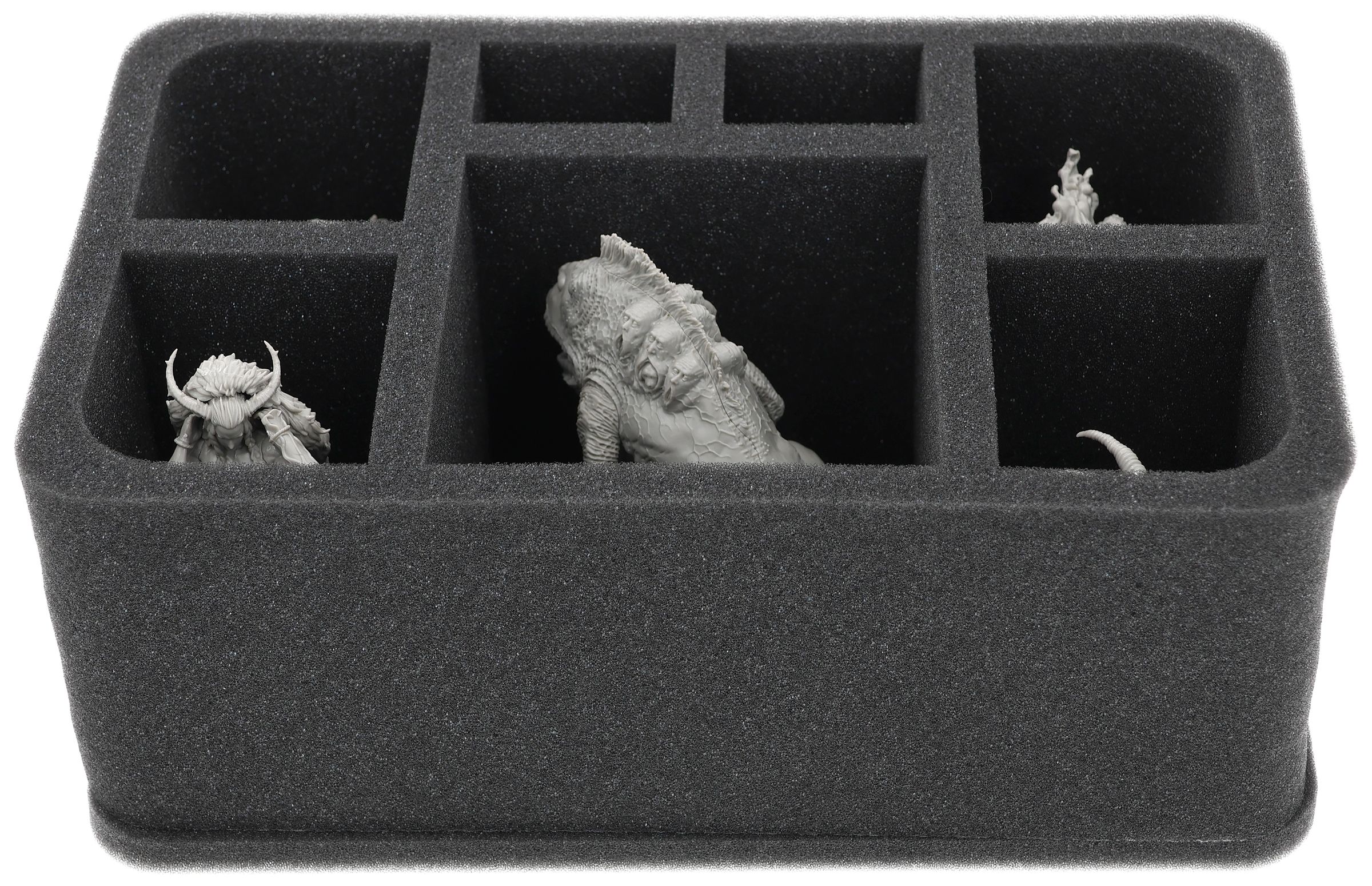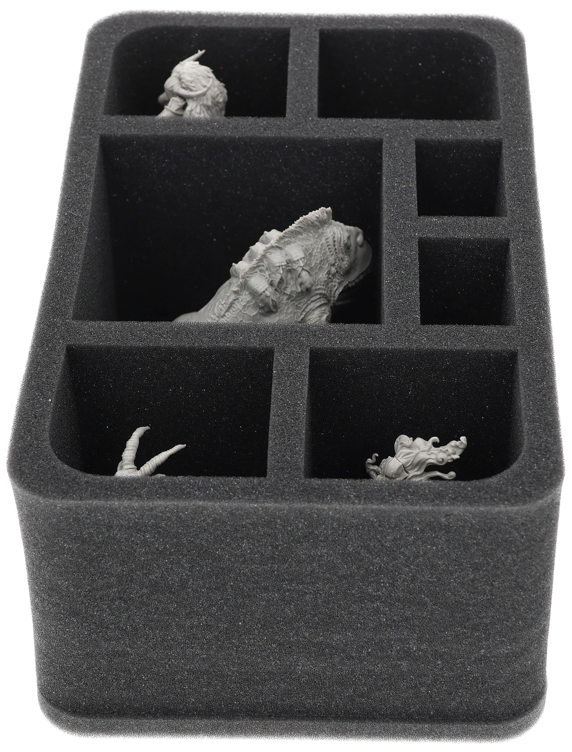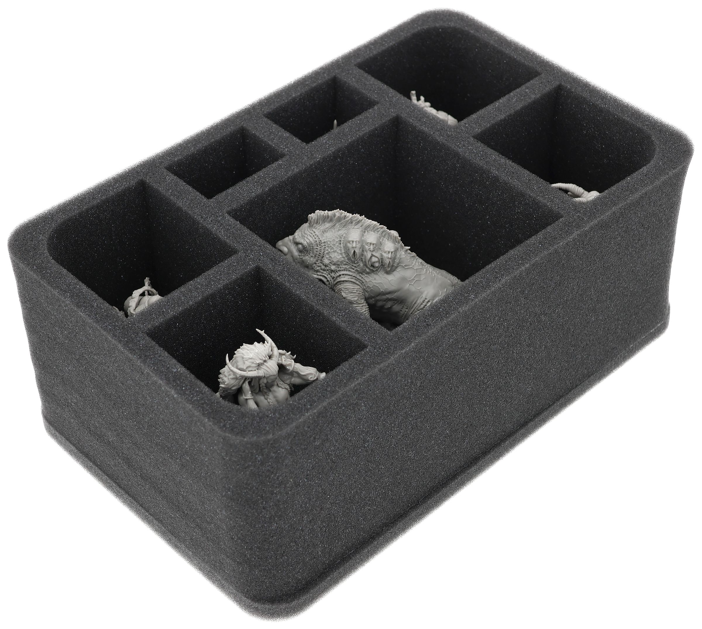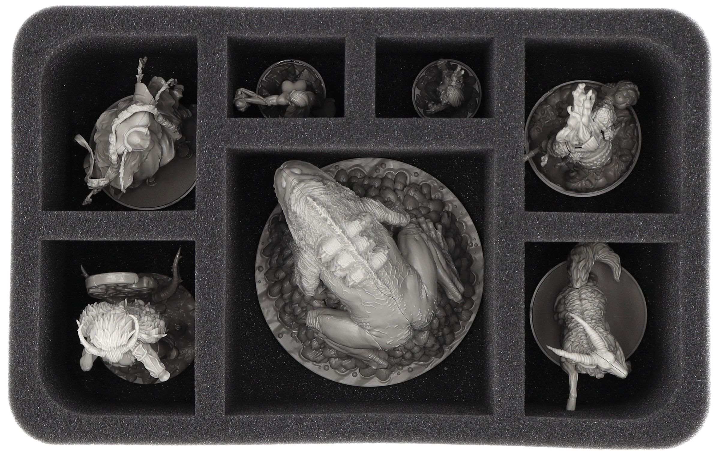 On this Feldherr foam tray, you have space for up to 7 miniatures from your Kingdom Death: Monster collection. The large compartment is suitable for the Frogdog and the other 6 compartments for miniatures from the other expansions.
