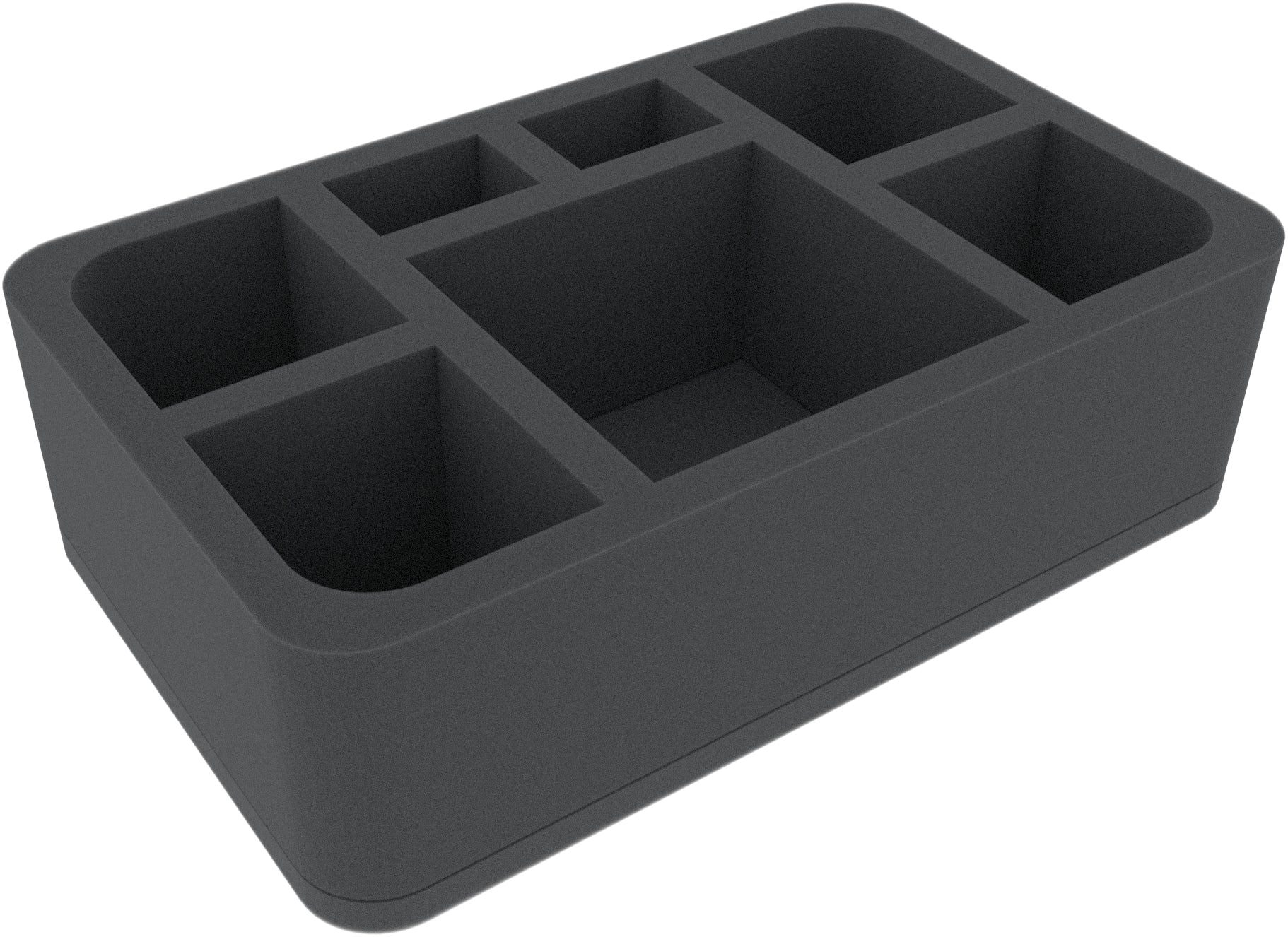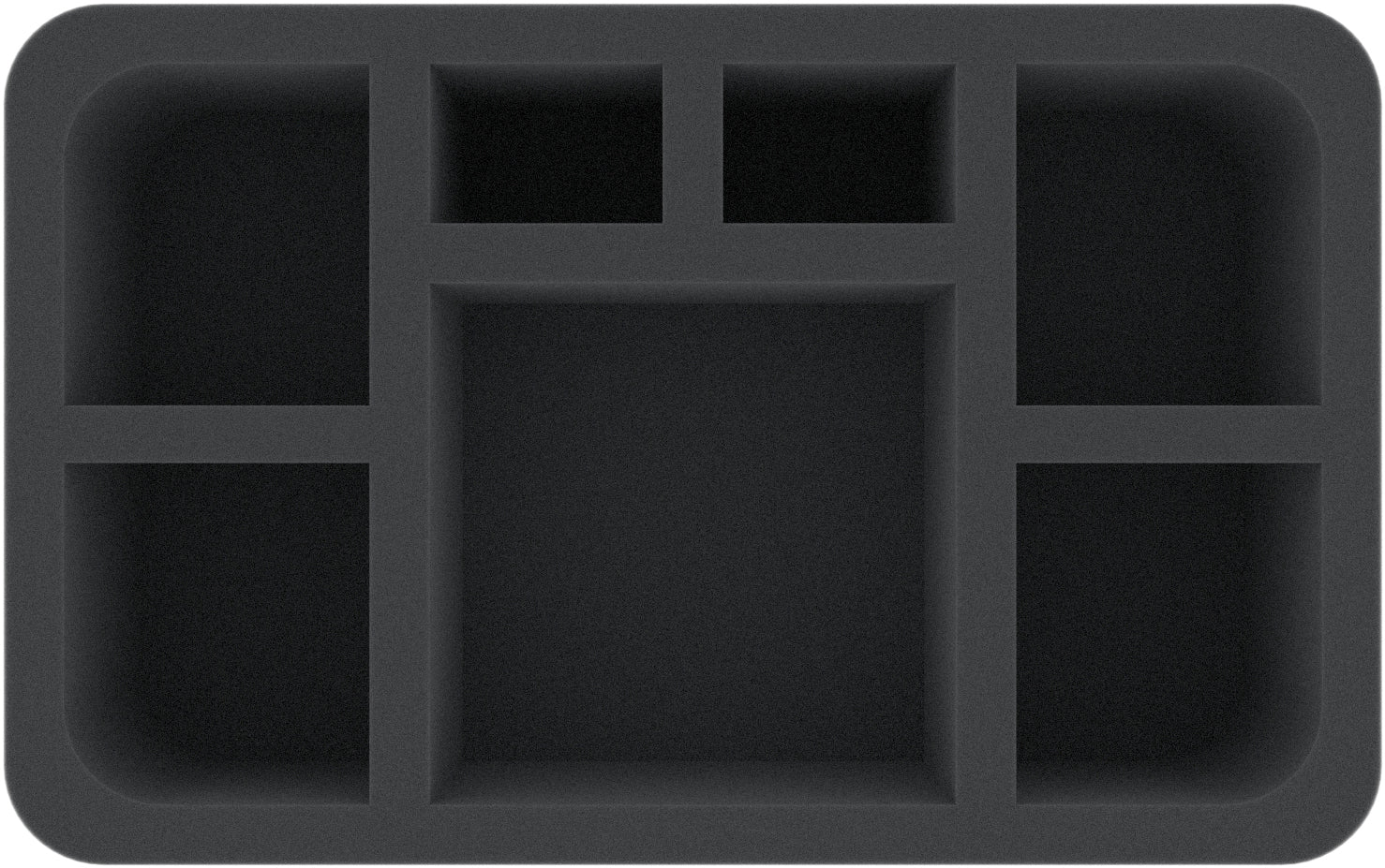 This Half-Size foam tray has 7 compartments of different sizes, one large square compartment, two medium-sized compartments and two smaller rectangular compartments. The insert is particularly suitable for safely storing a large miniature and several medium-sized figures for various board games and tabletop systems.
