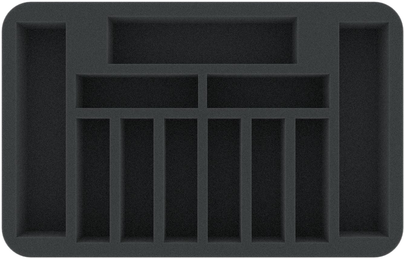 This 45 mm mm high foam tray is divided into 11 compartments. It is particularly suitable for the safe storage of tabletop and board game miniatures, as well as other fragile models and small parts.