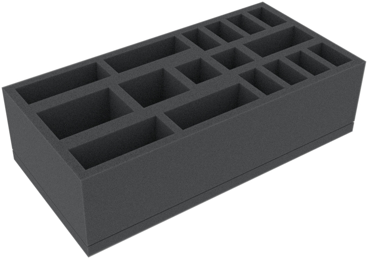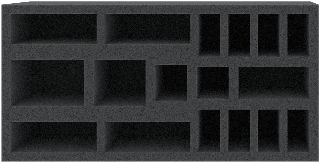 This 70 mm high foam tray is divided into 17 compartments. It is particularly suitable for the safe storage of tabletop and board game miniatures, as well as other fragile models and small parts.