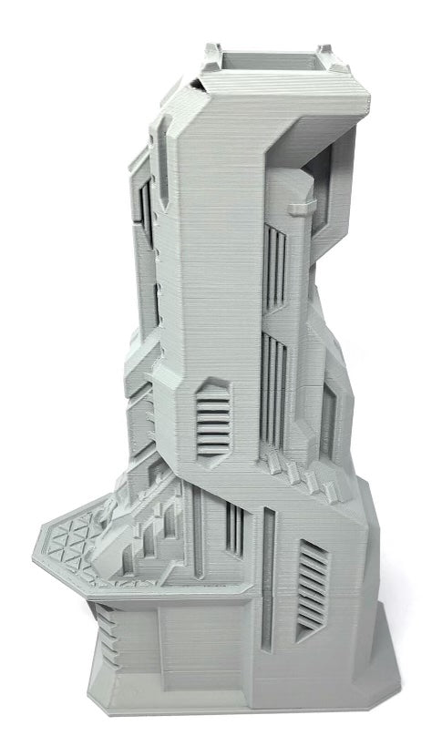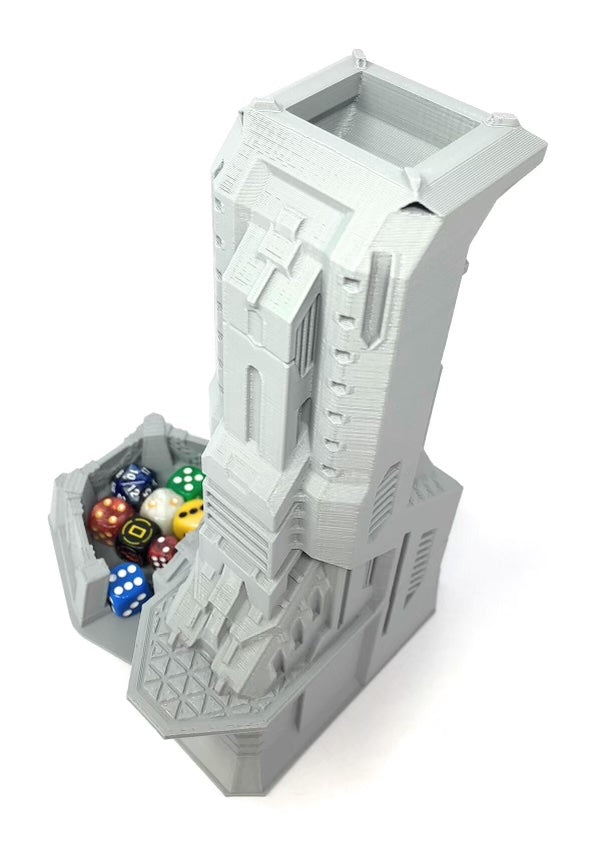 3D printed - detailed dice tower, with removable roof and exchangeable dice tray. The Dice Tower can also be used as a terrain part for your miniatures game or as a center piece for your next DnD session.