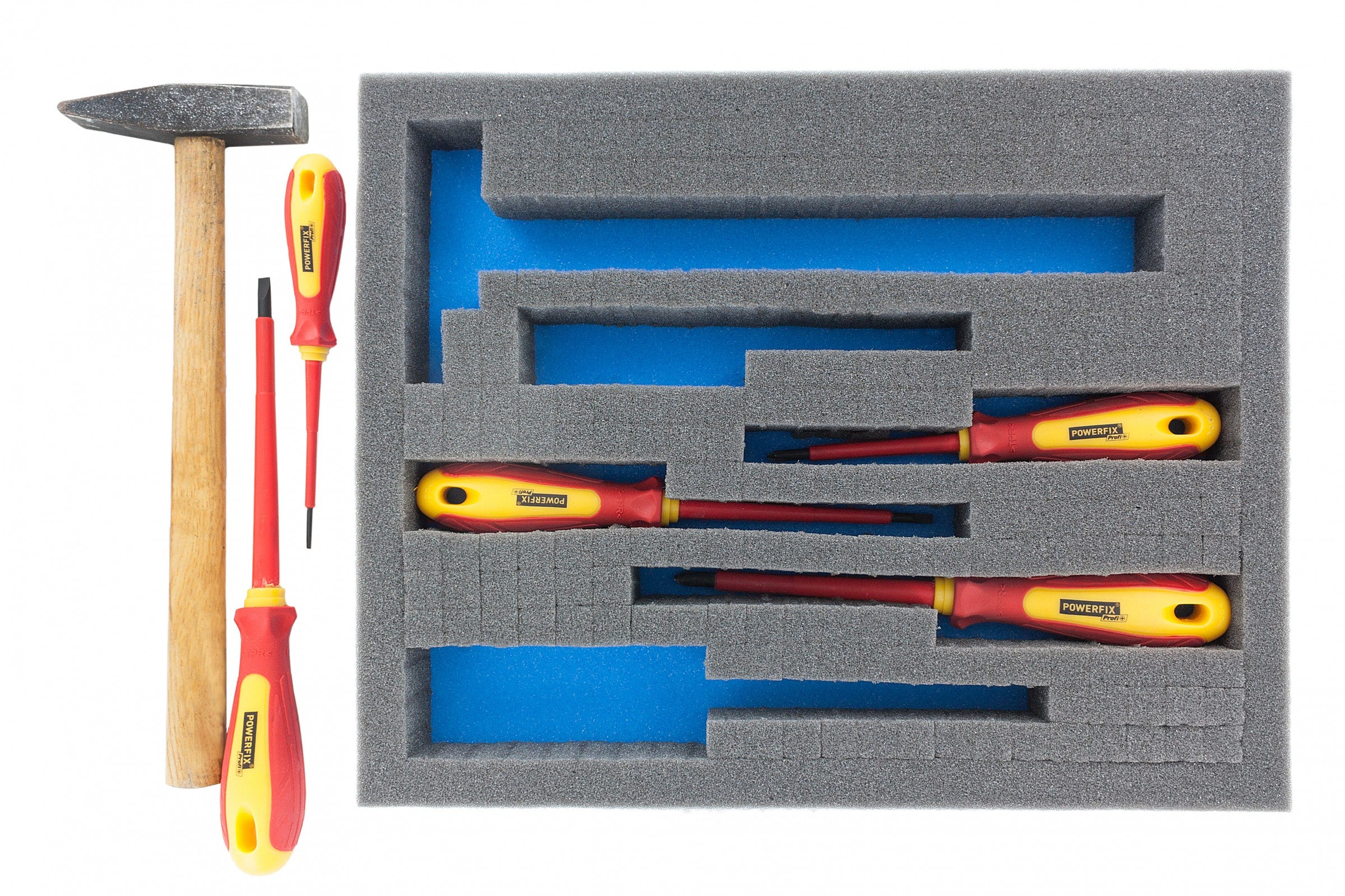 Zdjęcia przedstawiają przykład możliwego zastosowania pianki kolorowej FS010 wraz z wkładką z pianki siatkowej o grubości 25 mm (pianki siatkowe są dostępne oddzielnie od nas i nie wchodzą w skład tego zestawu!) Wymiary: 500 mm x 250 mm x 20 mm
