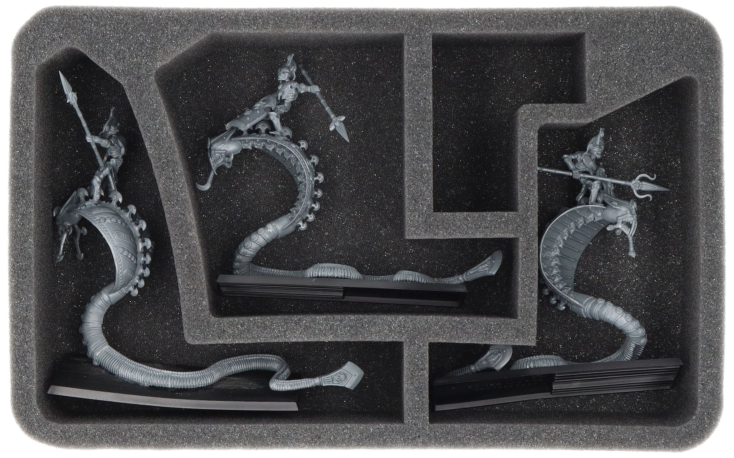 Na piankowej tacy znajdują się trzy miniaturowe, precyzyjnie wycięte przegródki na rycerzy Necropolis. Mniejsza komora jest idealna dla jednostek piechoty, takich jak Tomb King lub miniatury o podobnych wymiarach.