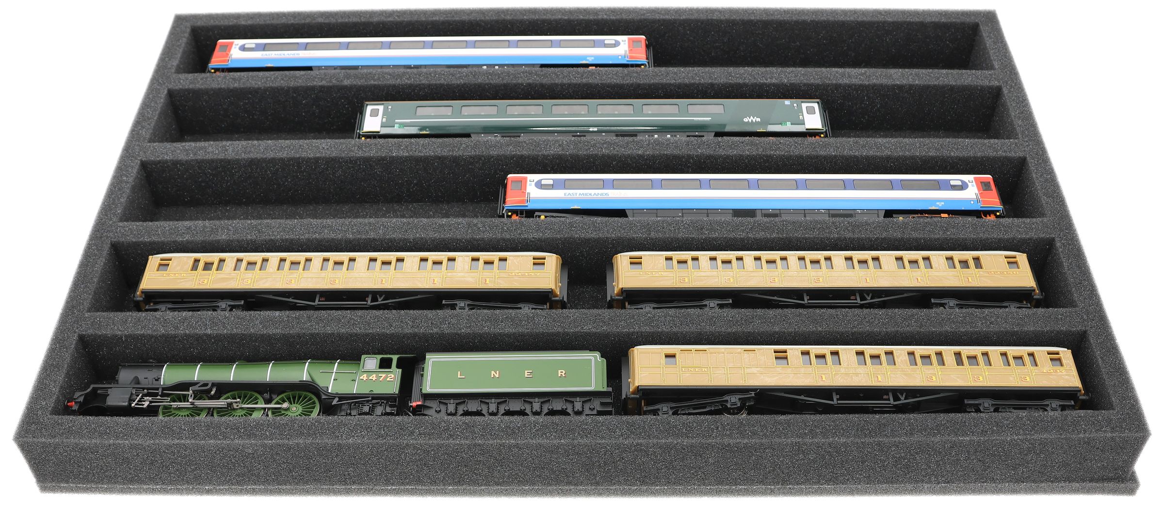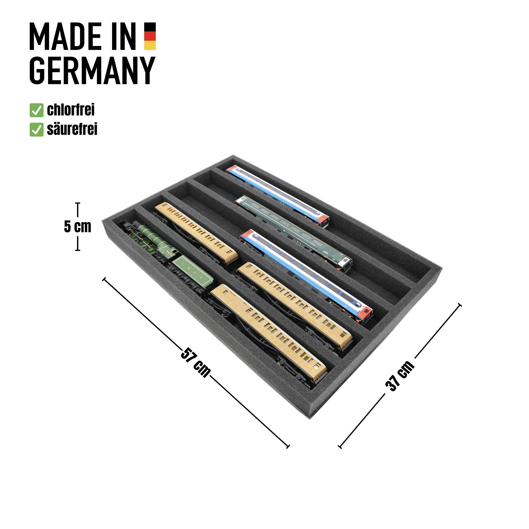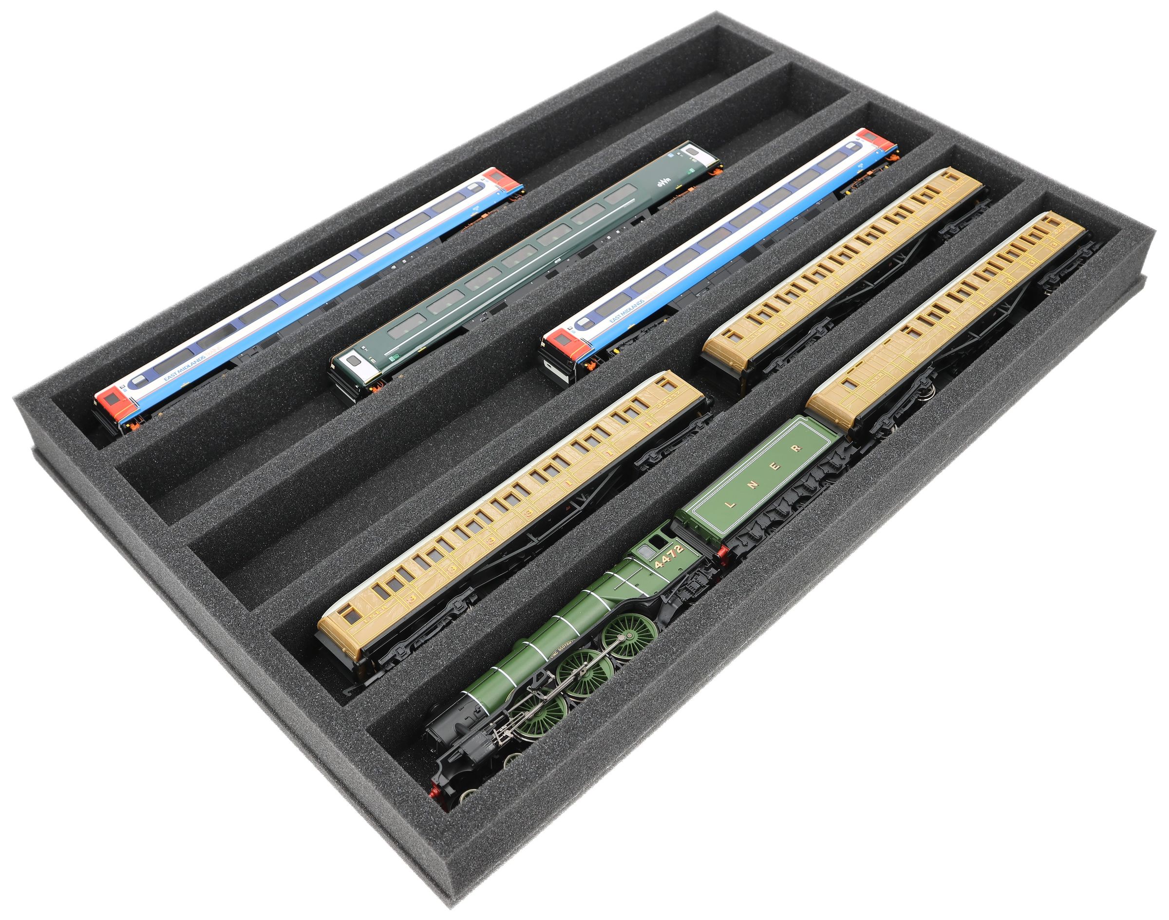Niezależnie od tego, czy chodzi o transport na wystawy, spotkania modułowe, czy bezpieczne przechowywanie na półkach w domu, ta wkładka niezawodnie chroni lokomotywy i wagony w skali 00. 5 przegródek utrzymuje modele w pozycji poziomej i chroni je przed uderzeniami i zadrapaniami.