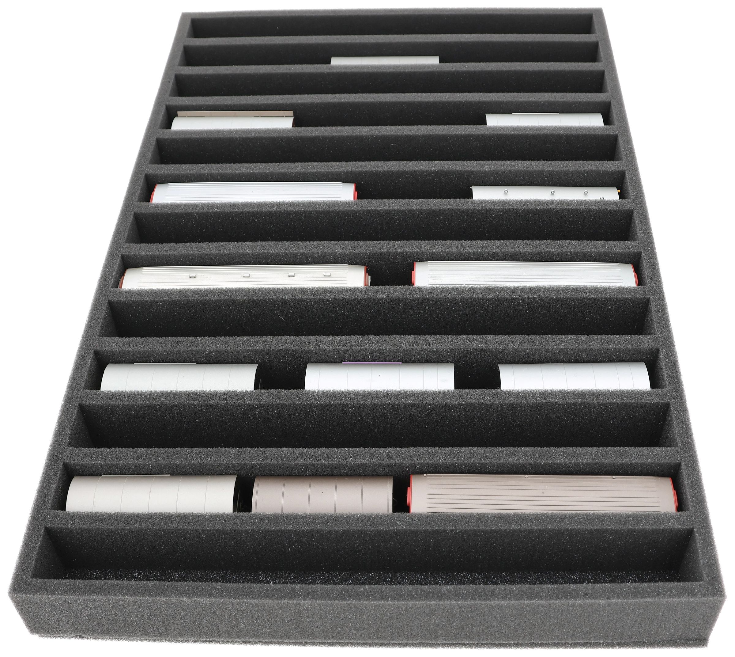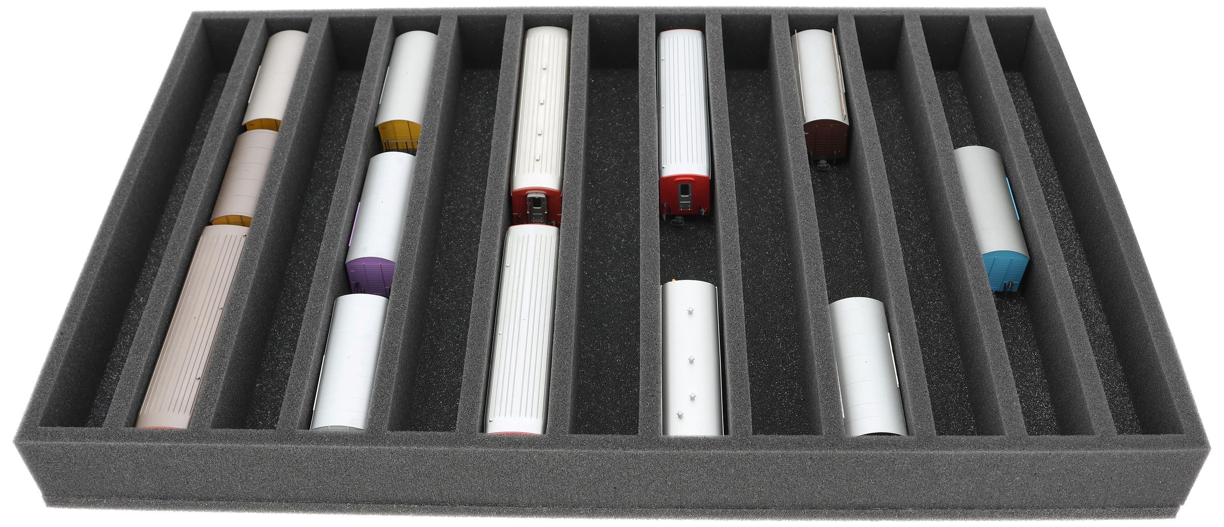 Whether for transport to exhibitions, module meetings, or safe storage on shelves at home, this insert keeps your H0m scale locomotives and cars reliably protected. The 13 compartments hold the models upright and shield them from bumps and scratches.